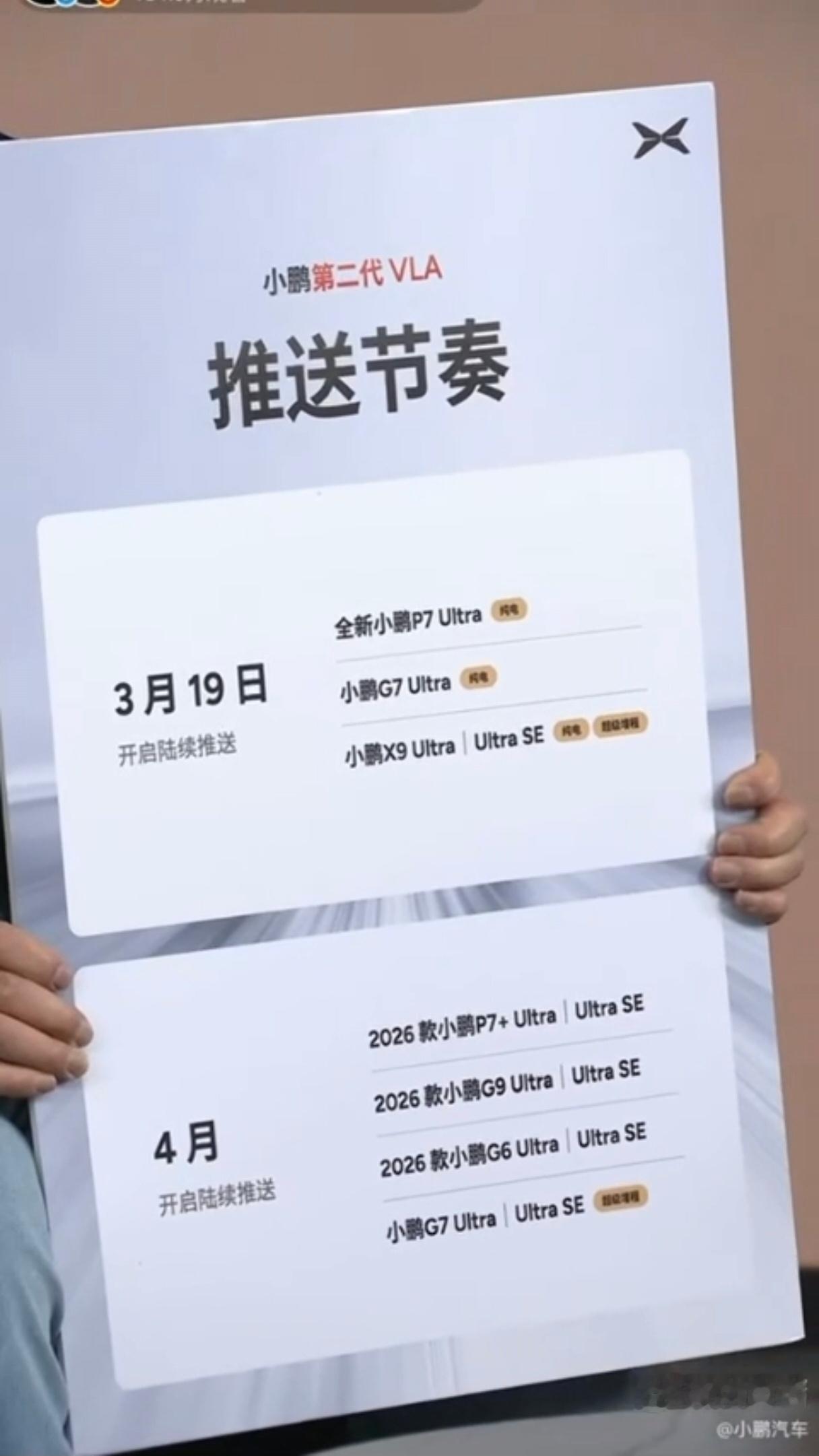 4月份将开启陆续推送更多车型:- 2026款小鹏P7+ Ultra|Ultra SE(纯电+超级增程)- 2026款小鹏G9 Ultra|Ultra SE- 2026款小鹏G6 Ultra|Ultra SE(纯电+超级增程)- 小鹏G7 Ultra|Ultra SE(超级增程)