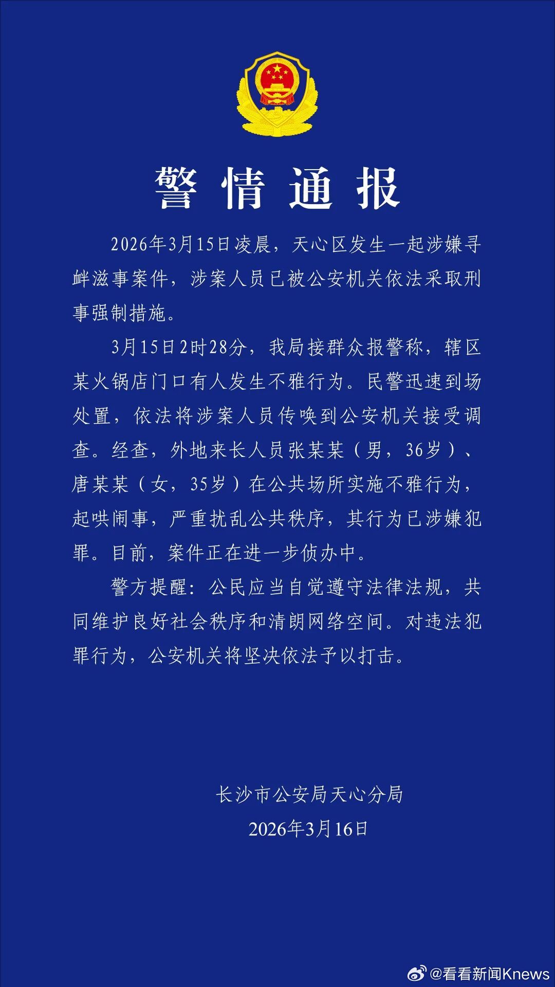【#警方通报火锅店门口不雅行为#】3月16日,湖南长沙市公安局天心分局发布警情通报:2026年3月15日凌晨,天心区发生一起涉嫌寻衅滋事案件,涉案人员已被公安机关依法采取刑事强制措施。