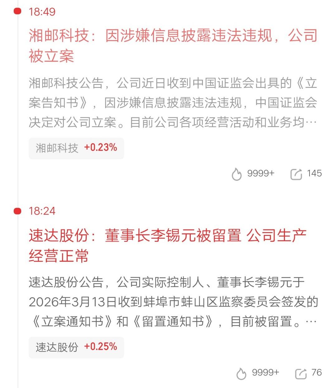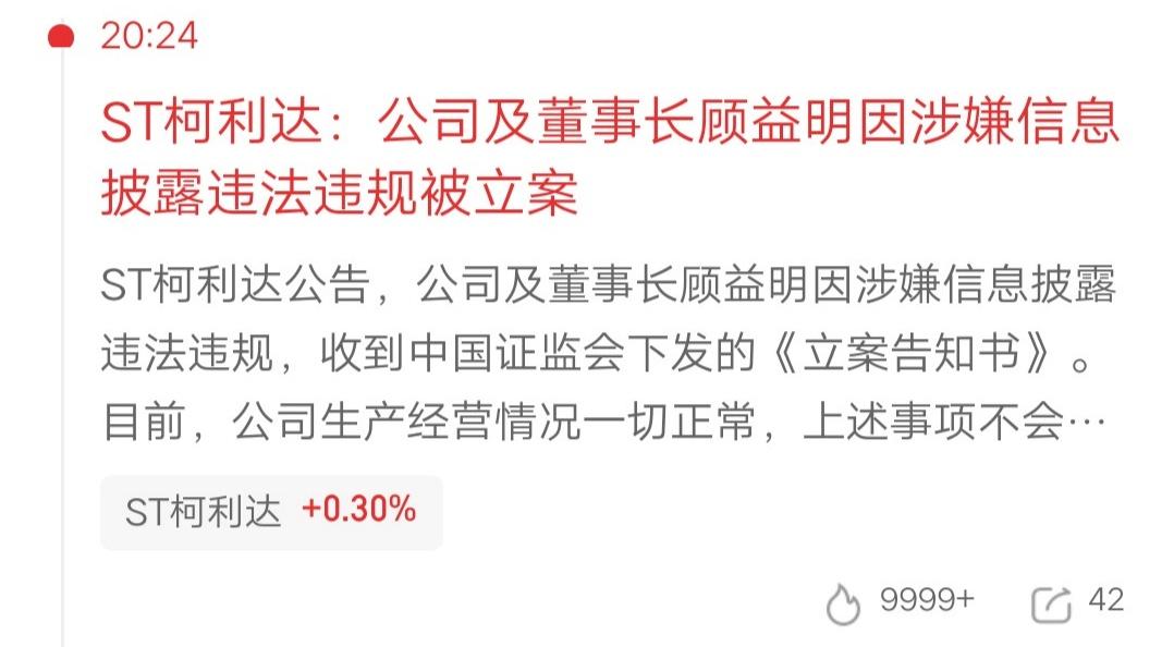 人倒霉起来喝凉水都塞牙,三只股票突发核弹级利空,4.17万股东踩雷。明天股价危险了,账户要大亏呀。 ST柯利达:公司及董事长顾益明因涉嫌信息披露违法违规被立案 湘邮科技:因涉嫌信息披露违法违规,公司被立案 速达股份:董事长李锡元被留置 公司生产经营正常 上面对违法违规行为的打击力度,比以前严多了,而且是常态化了。今天直接爆了三个,有点吓人呀。所以大家选股要十分认真了,公司基本面要过关,再结合图形,这种大坑基本都能避开。 切勿抱有侥幸心理,认为自己不会那么倒霉,要想长期在市场做下去,一定要认真对待,不要混日子。
