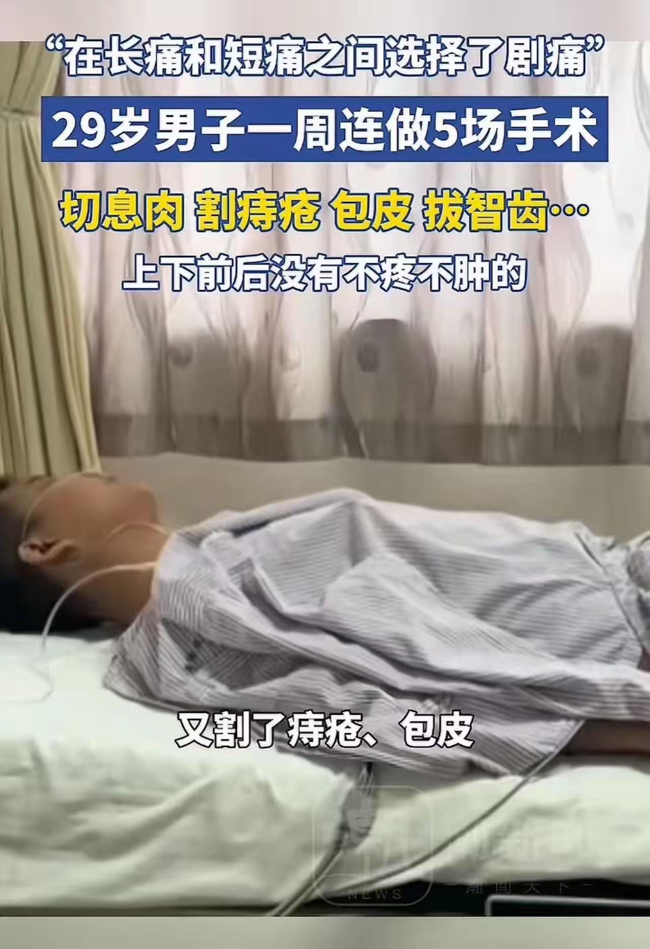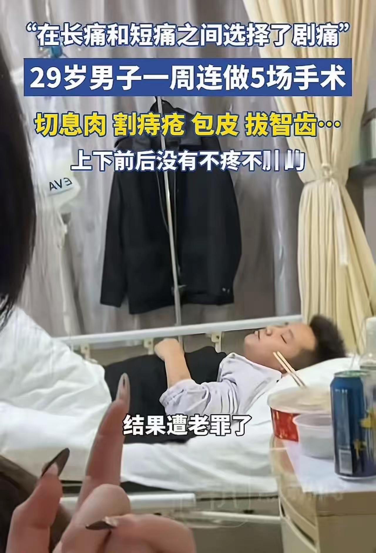一周连做5场手术,把身体所有零件“修”了个遍:这个男人,到底有多狠? 你见过对自己最狠的人是什么样的? 辽宁一位29岁男子,用亲身经历给出了答案——狠到一周之内,连做5场手术!从肠息肉到痔疮,再到包皮,从上到下,从前到后,能割的都割了,能切的都切了。 用他自己的话说:“上下前后,没有不疼不肿的!” 网友的神评论更是一针见血:“在长痛和短痛之间,他选择了剧痛!” 看完这条新闻,我笑出了声,笑着笑着,又笑不出来了。 因为这种“一次性解决所有问题”的冲动,我们每个人或多或少都有过。 牙疼的时候想,干脆全拔了换假牙;近视的时候想,干脆一次性把度数做掉;体检发现一堆小毛病的时候,是不是也闪过一个念头:能不能一次住院,全都给我搞定? 这个大哥,只是把我们都想过的事,付诸实践了而已。 可问题是,身体不是汽车,不能一次性送进4S店做大保养。汽车零件可以批量更换,人体器官却受不了这种“团购式”的修理。 你想想,肠息肉切除,要禁食;痔疮手术,不能用力;包皮手术,怕摩擦。这三个“不能”凑到一起,就问你,怎么上厕所?怎么躺?怎么坐?站着疼,坐着也疼,趴着压到前面,侧着又扯到后面——那真是求生不得,求死不能。 说到底,这种“一次性解决”的心态,暴露了我们这代人对“效率”的病态追求。 吃饭要快餐,快递要次日达,连看病都想“一次搞定”。我们恨不得把所有痛苦压缩在一起,然后告诉自己:忍一忍,熬过去就好了。 可人生哪有那么多“一次性解决”?有些苦,就是要慢慢吃;有些病,就是要慢慢养;有些路,就是要一步一步走。 更扎心的是,这种急功近利的心态,不只是用在治病上。 谈恋爱,恨不得一次相亲就确定终身;找工作,恨不得第一份工作就干到退休;教育孩子,恨不得一次补习班就提分50。我们被“效率”绑架,被“速成”洗脑,最后往往像这位大哥一样——本想省事,结果遭罪。 可我还是想说,这个大哥,虽然身体遭了罪,但他身上有一样东西,值得我们尊重:那就是对生活的负责。 他为什么要把所有手术攒到一起做?因为他平时要上班,要赚钱,要养家。他请不起五次假,付不起五次住院费,承担不起五次恢复期对生活的影响。他不是不懂分开做更舒服,而是生活不允许他那么“奢侈”。 他选择一次性扛下所有,是因为他身后没有可以让他慢慢来的资本。 这才是最扎心的地方。 那些嘲笑他的人,可能不知道,在这个世界上,有很多人就是这样“凑合”着把自己的身体、生活、甚至人生,硬生生扛下来的。他们不是不想对自己好一点,而是没有那个条件。 所以,我想对这个大哥说:狠人,下次别这么狠了。身体不是修修补补就能一直用的机器,它是陪你走完一生的唯一伙伴。 也想对所有人说:有些事急不得,有些人等得起,有些苦,真的不必一次性吃完。 你体检发现小毛病的时候,有没有想过“一次性解决”?来评论区聊聊,你的身体,还扛得住吗?