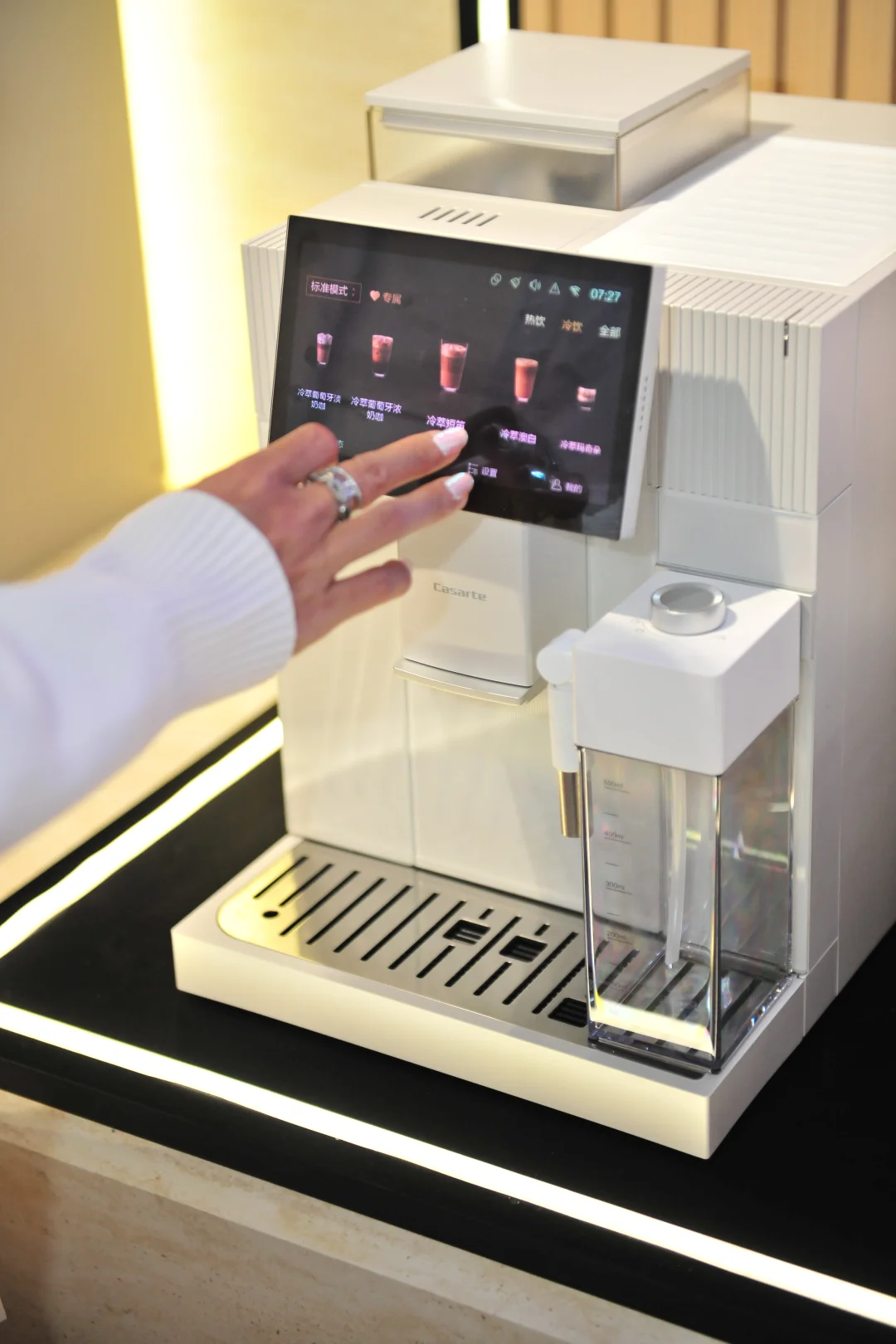 转角遇到卡萨帝揽光套系的金杯Pro咖啡机,作为咖啡星人直接走不动道了。工作人员介绍它搭载了AI智萃系统,可以萃取黄金风味,AI智慧调节还能记录每个人的口味习惯。还有Smart ID Tech智慧识豆技术实现OCR和图像智能双识别,AI智能提取咖啡豆信息并匹配最佳萃取方案,太厉害了。35℃以下低压脉冲冷萃,可以降低肠胃刺激,喝完接着运动一点都不会不舒服。适配健身运动人群需求想想周末早晨,不用去咖啡馆排队,在家就能喝到冠军同款品质的咖啡,这种幸福感太戳人了。