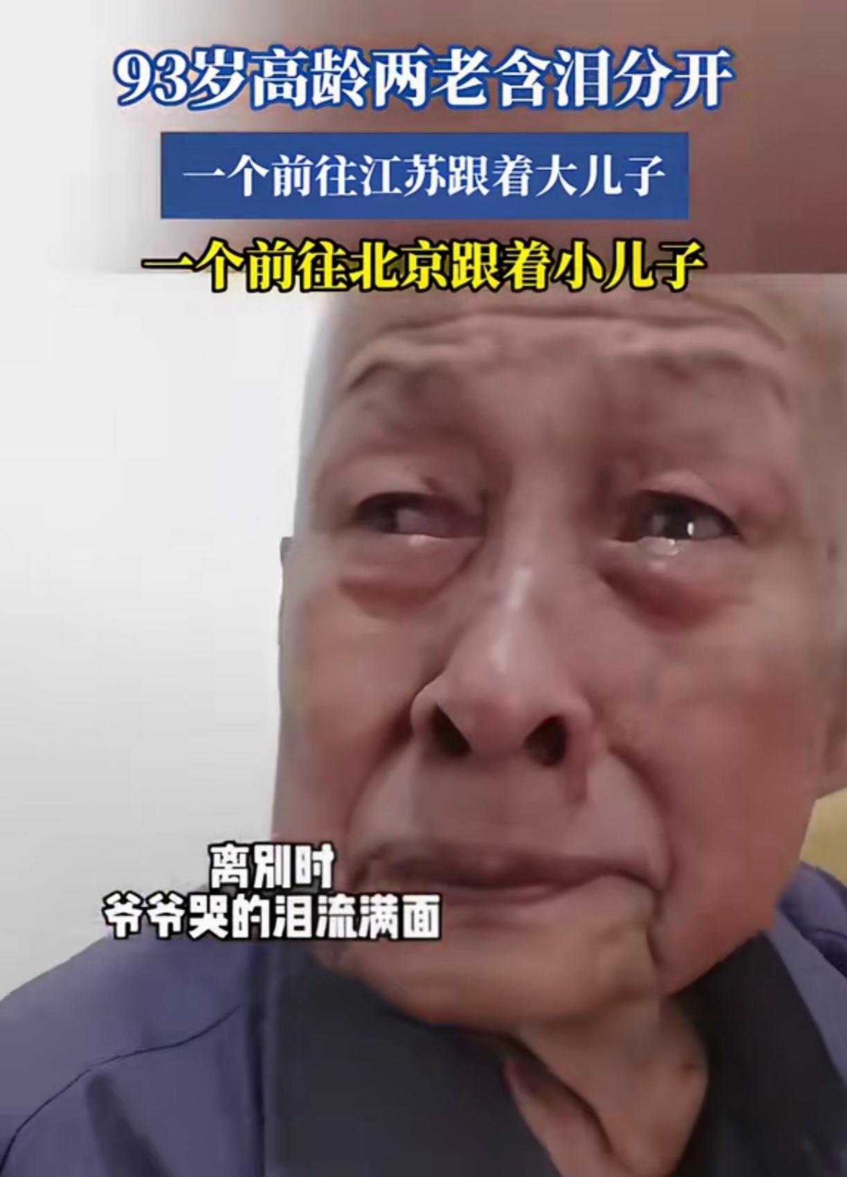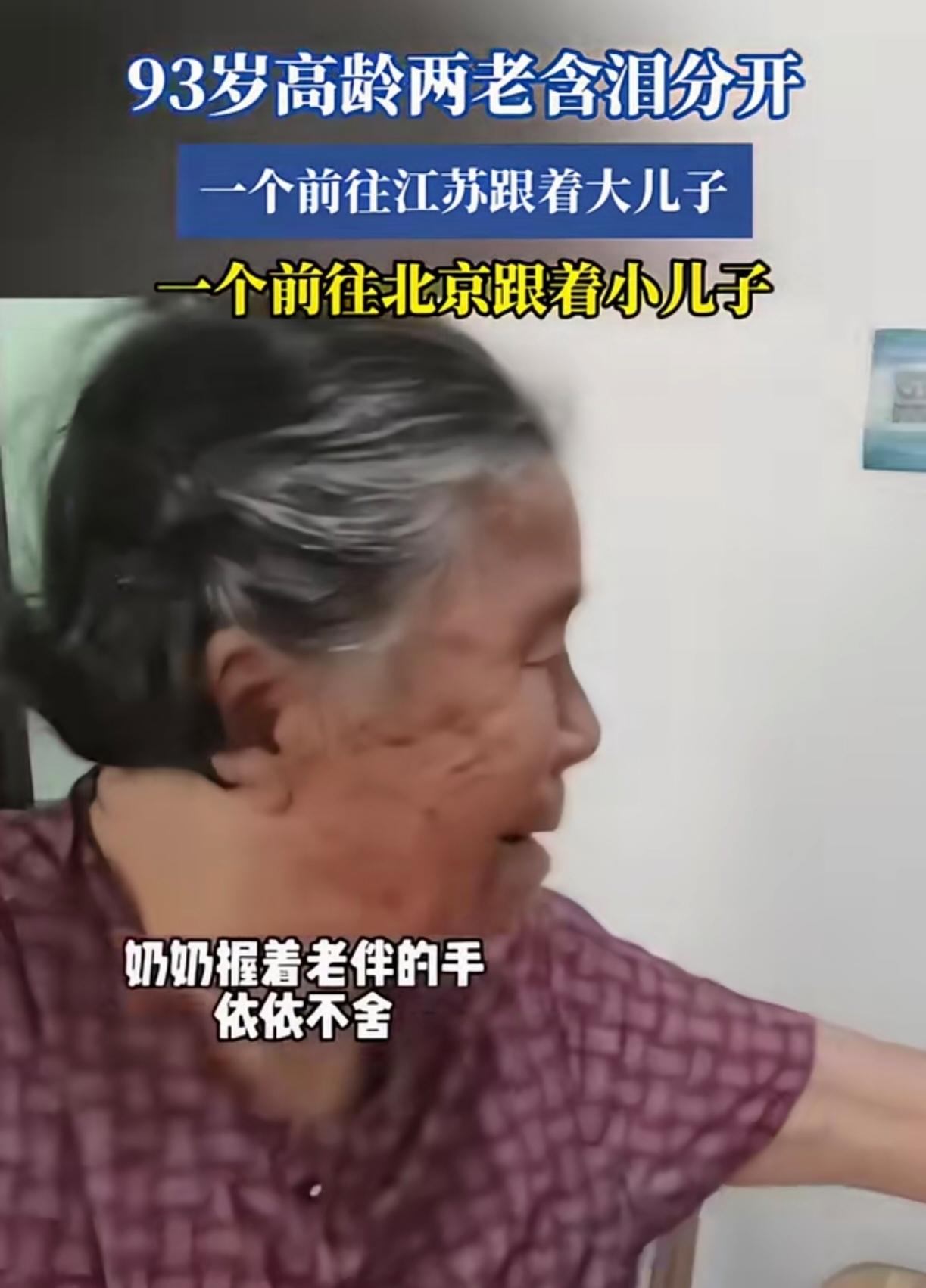 父母健在且年纪都大了,做子女的是会选择两老一起照顾还是分开照顾? 前几天看了一个视频,爷爷奶奶93岁高龄却被迫分开,一个跟随大儿子前往江苏,一个跟随小儿子前往北京,视频中两老分开的时候,爷爷哭成了泪人。这个视频短短几天,播放量超百万,网友们也纷纷留言: A网友:两老这么大年纪了,为什么要把他们分开?虽然都有人赡养,但是也应该考虑考虑两老的情况,都知道年轻夫妻老来伴,这么大年纪了,还这样分开,最后还有没有可能再见一面都难说。 B网友:孩子太不孝顺了,就不能两老一起轮换着养,或者孩子们出钱请保姆或送养老院都比这样分开要强。 C网友:我们家老人就是分开养的,大家说的是不错,但现实中这种分开养的情况不在少数,实际困难也不是一两句话就能说的清楚的。 D网友:我爷爷奶奶当时也是,爷爷跟着我爸妈,奶奶跟着我大伯同在一个村。奶奶到了大伯家不久就总是生病,有天晚上去看奶奶,奶奶捂着肚子说肚子疼,看到奶奶吃的饭都是剩菜剩饭,我回到家给爸妈哭想把奶奶接到我家来,后面确实接过来了,爷爷奶奶都是在我家寿终正寝的,爷爷走的时候96岁。 不知道事情的全貌,不好发表意见,有时候即便知道事情的原委,也不一定能得到更好的解决办法,那种深深的无力感没经历过的人是无法真正理解的。 总之,人生在世,每个人有每个人的难,每个家庭有每个家庭的不易。如果你遇到这样的事情,你会怎么做?欢迎评论区说说你的看法。