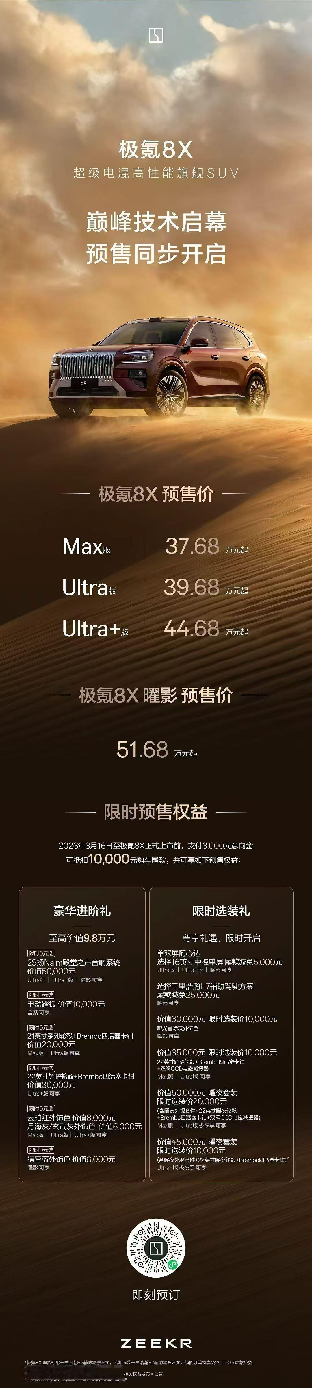 Max37.68 万起、Ultra39.68 万起、Ultra+44.68 万起,顶配曜影版 51.68 万起。说实话高性能曜影版本,更多作为一个“摸到50w”的旗帜存在,实际成交价格在40w之内,对于现有市场上的产品,有很大的冲击力。看配置表可能没用,摸到实车应该就能体会到了。极氪8X极氪8X新公路之王