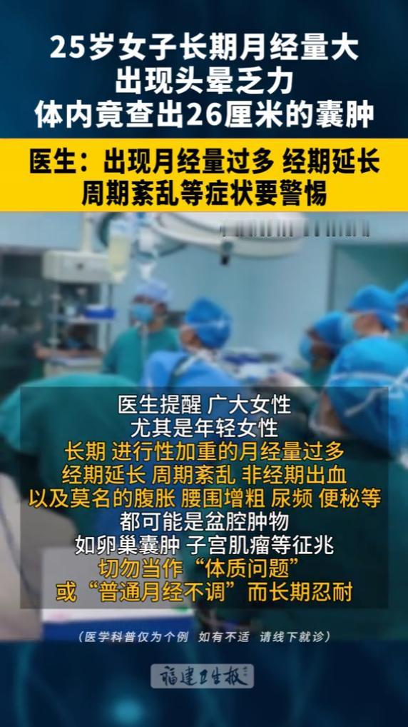 “悲剧还是发生了!”近日,湖北武汉,一女子长期月经量大,并且经期延长不止,最近,她甚至出现了乏力头晕不适的症状,去医院检查后,才发现女子已经中度贫血,并且盆腔内还藏着一个巨型包块,同时子宫内还藏着一枚黏膜下肌瘤!网友:万万没想到! 25岁的孙女士,平时在办公室上班,原本以为自己身体没什么大问题,可一场突如其来的意外,让她彻底慌了神。 那天晚上办公室的日光灯还亮着,孙女士正在加班,突然眼前一黑,直接倒了下去,身边同事的惊呼声、椅子倒地的闷响,还有人着急喊着要叫救护车,这些声音在她听来,就像隔着一层水,模糊又遥远,她怎么也想不到,自己会以这样狼狈的方式,被紧急送到武汉市中心医院杨春湖院区的急诊室。 经过一系列检查,医生拿着检查单皱起了眉头,检查结果让所有人都很意外,孙女士的血红蛋白严重偏低,已经达到了中度贫血的程度。 更让人揪心的是,B超检查显示,她的盆腔里藏着一个直径26厘米的巨型包块,差不多有一个小西瓜那么大,除此之外,子宫腔内还长着一枚黏膜下肌瘤。 其实身体早就给孙女士发出过很多警报,只是都被她忽略了。孙女士的月经从来就没正常过,每次来月经,经量都特别大,就像开了闸的水龙头,而且经期还特别长,常常十天半个月都止不住,除此之外她还总觉得浑身乏力,稍微动一动就累,爬几层楼梯就心慌气短,嘴唇也总是没有血色,脸色看起来苍白憔悴。 可即便身体出现了这么多不适,孙女士也没放在心上,她一直觉得这都是因为工作太累、经常加班,体质变得虚弱导致的,根本没往生病的方向想,平时不舒服了,就自己买点补血的东西吃,总觉得忍一忍、扛一扛,慢慢就会好起来,从来没想过要去医院做一次全面检查。 现在想想这真是一个致命的误判,医生后来解释说,那枚长在子宫腔里的黏膜下肌瘤,就像一块石头堵在河道中央,导致子宫内膜的面积越来越大,子宫没法正常收缩,经血就这么一点一点地持续流失,每次经期都拉长到半个月,铁元素也跟着血液不断流失,时间久了贫血就像滚雪球一样,越来越严重,最后才导致她突然晕倒。 其实很多女性都有过类似的想法,把月经异常当成羞于启齿的小毛病,要么觉得忍一忍就过去了,要么就简单归结为“内分泌失调”“排毒”,从来不会认真对待,可大家不知道,这些看似不起眼的症状背后,可能藏着致命的危险,就像孙女士这样,小小的月经异常,背后竟然藏着巨型包块和肌瘤。 万幸的是孙女士还算幸运。医生考虑到她才25岁,还没有结婚生孩子,特意给她定制了微创手术方案,只需要从肚脐开一个小口,就能把盆腔里的巨型包块和子宫里的肌瘤全部拿掉,手术很成功,她的腹部几乎看不出疤痕,而且子宫也被完整保留了下来,以后也不会影响正常怀孕。 可医生也说如果再晚半年发现,情况可能就完全不一样了,后果不堪设想,这个故事里最让人揪心的不是26厘米的巨型包块,也不是肌瘤而是那些被一次次忽略的身体信号,经量骤增、经期延长、非经期出血,这些都不是小事,更不是一句“内分泌失调”就能糊弄过去的,它们都是子宫在拼命向我们发出求救信号。 其实一次妇科B超,也就一百块左右,就能早早发现这些悄悄长大的隐患,现在的微创技术也很发达,能把原本的大手术变成小创口,不用承受太大的痛苦。可为什么还有那么多女性,明明身体已经出现不适,却还是选择硬扛? 或许是因为羞耻感,或许是抱着侥幸心理,又或许是觉得“忍一忍就过去了”,但身体从来不会撒谎,你忽略它的警告,它就会用越来越重的代价,逼你正视它,现在孙女士恢复得很好,她说以后再也不会把月经异常当成小事了,只是不知道还有多少女性,正在重复她曾经的错误,继续硬扛着身体的不适,忽视那些致命的信号。 (信息来源:《武汉 25岁女子长期月经量大,出现头晕乏力,体内竟查出26厘米的囊肿 。医生 :出现月经量过多、经期延长、周期紊乱等症状要警惕!》福建卫生报)
