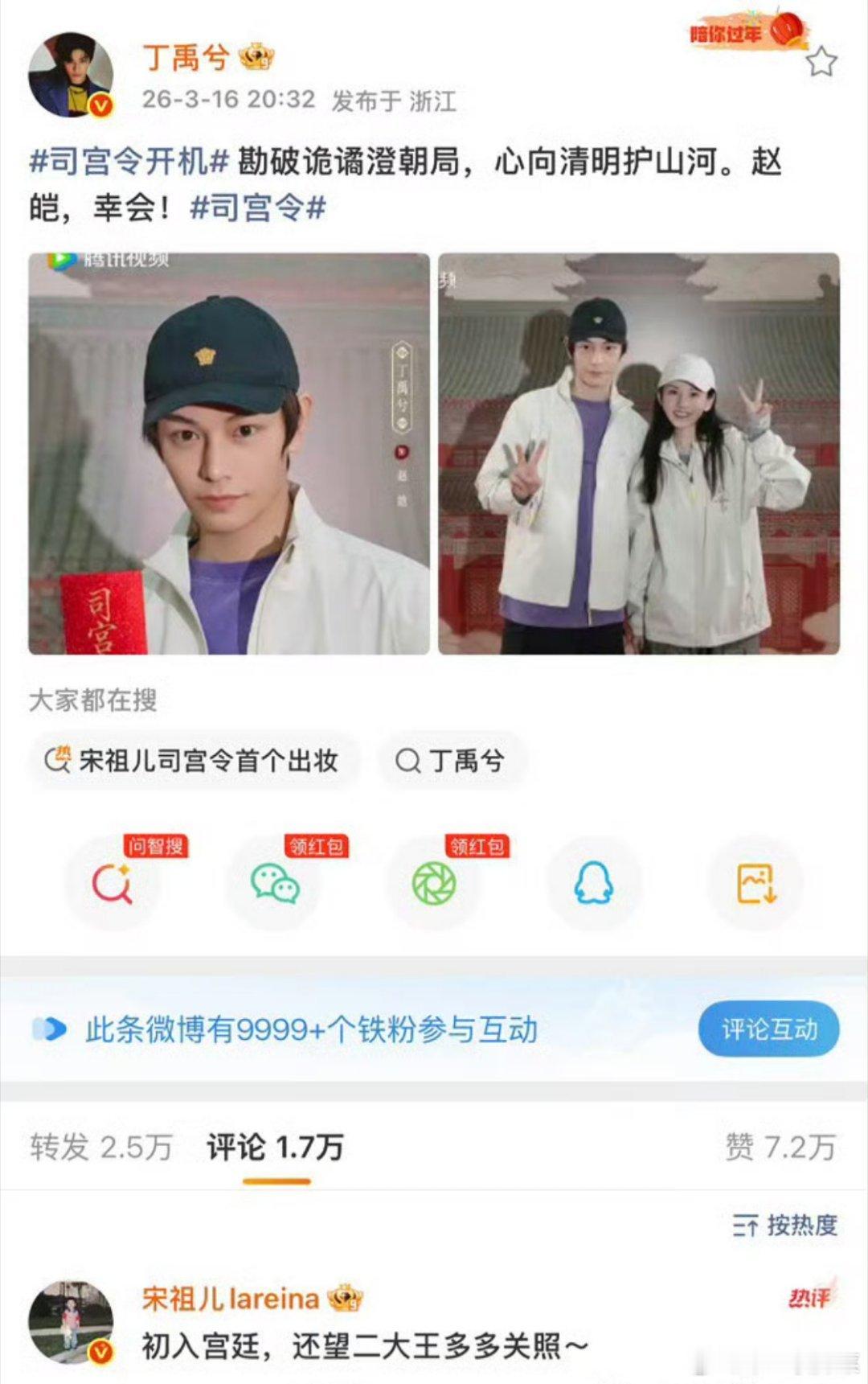 宋祖儿回复丁禹兮 司宫令刚开机,丁禹兮宋祖儿两位主演就已经开始互动营业了