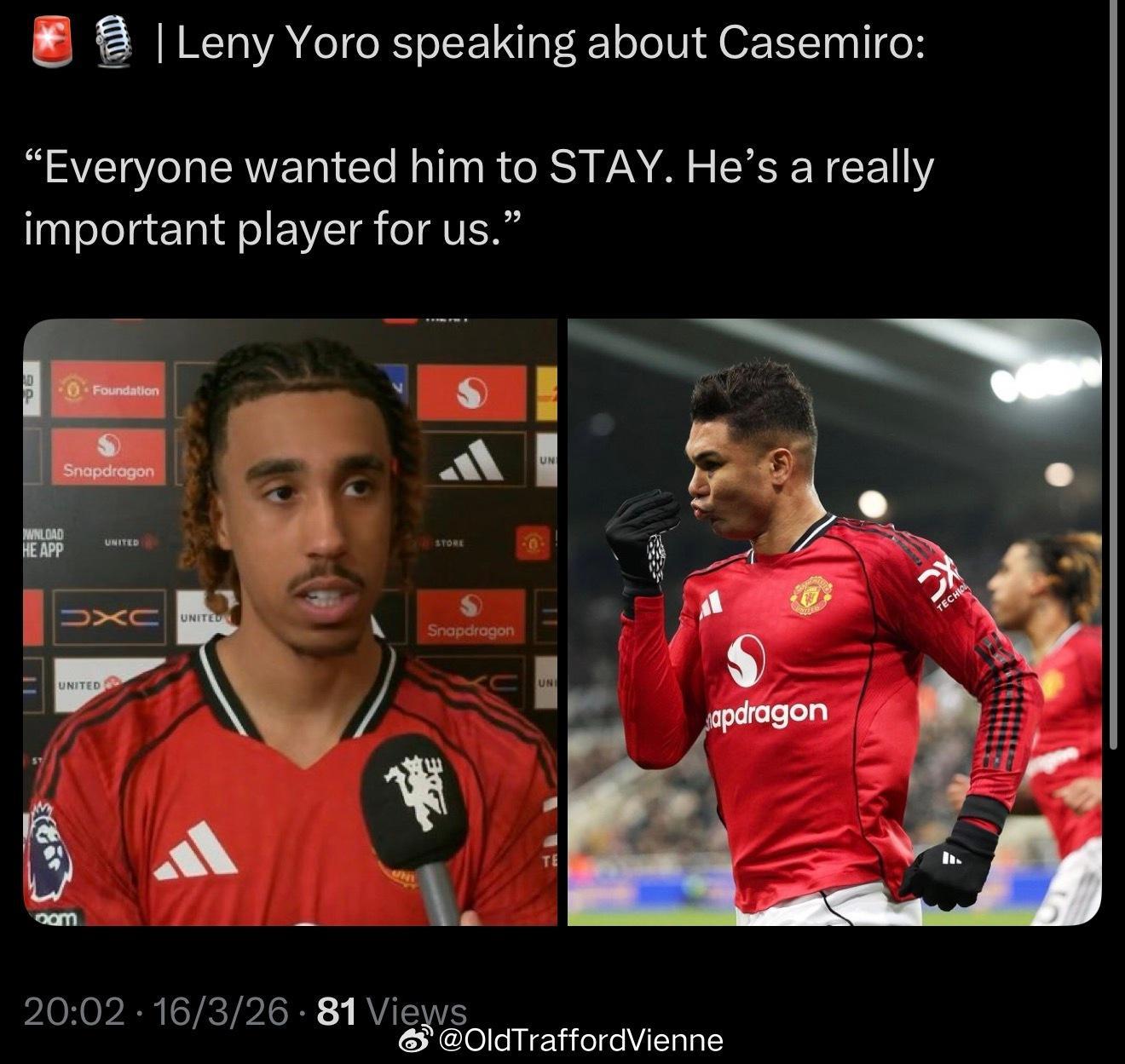 约罗谈卡塞米罗:“每个人都希望他继续留在曼联,他真得对我们很重要。”