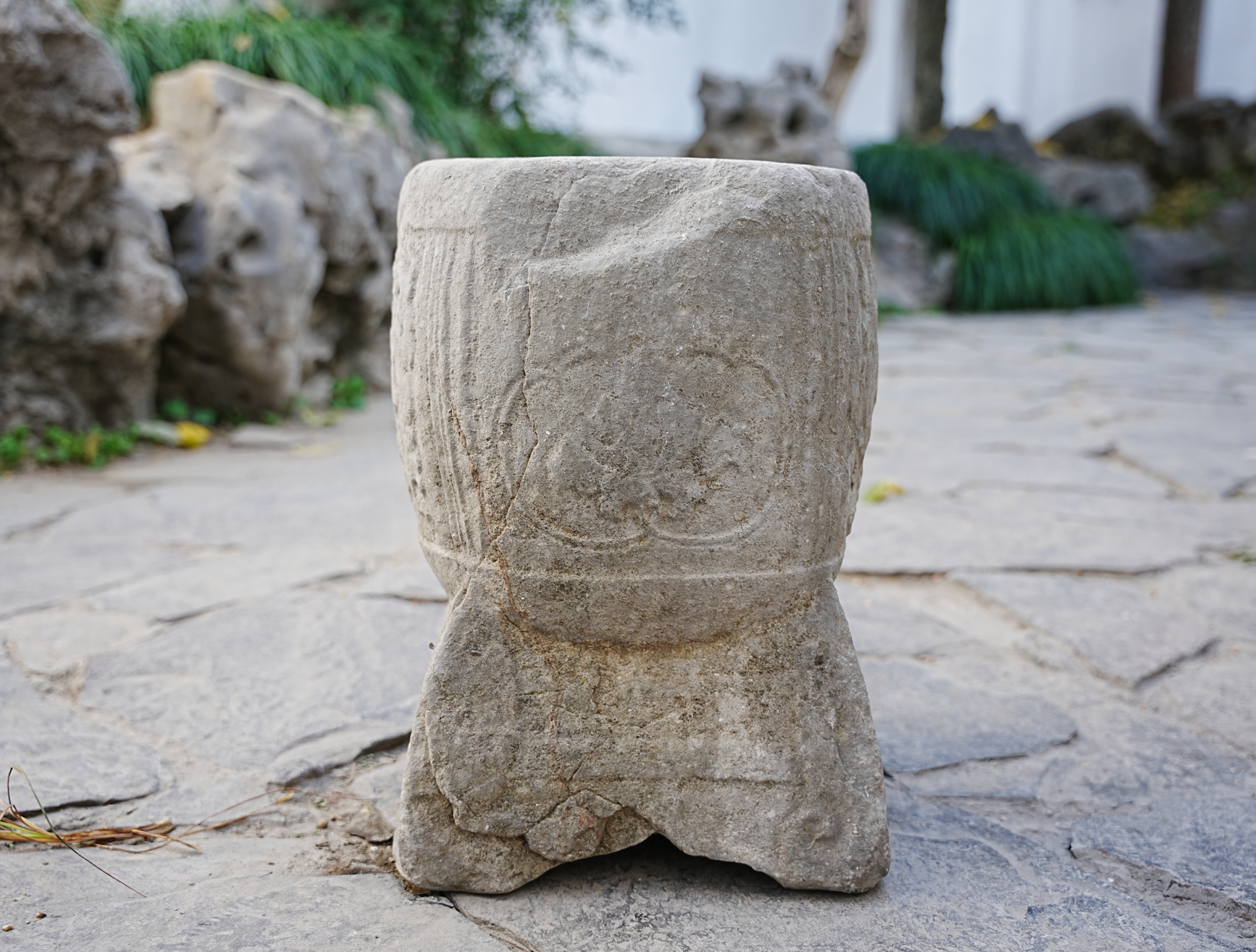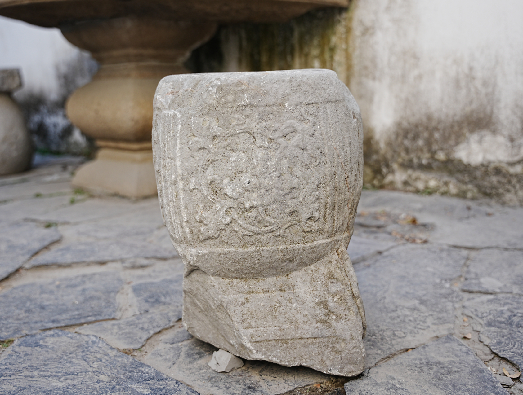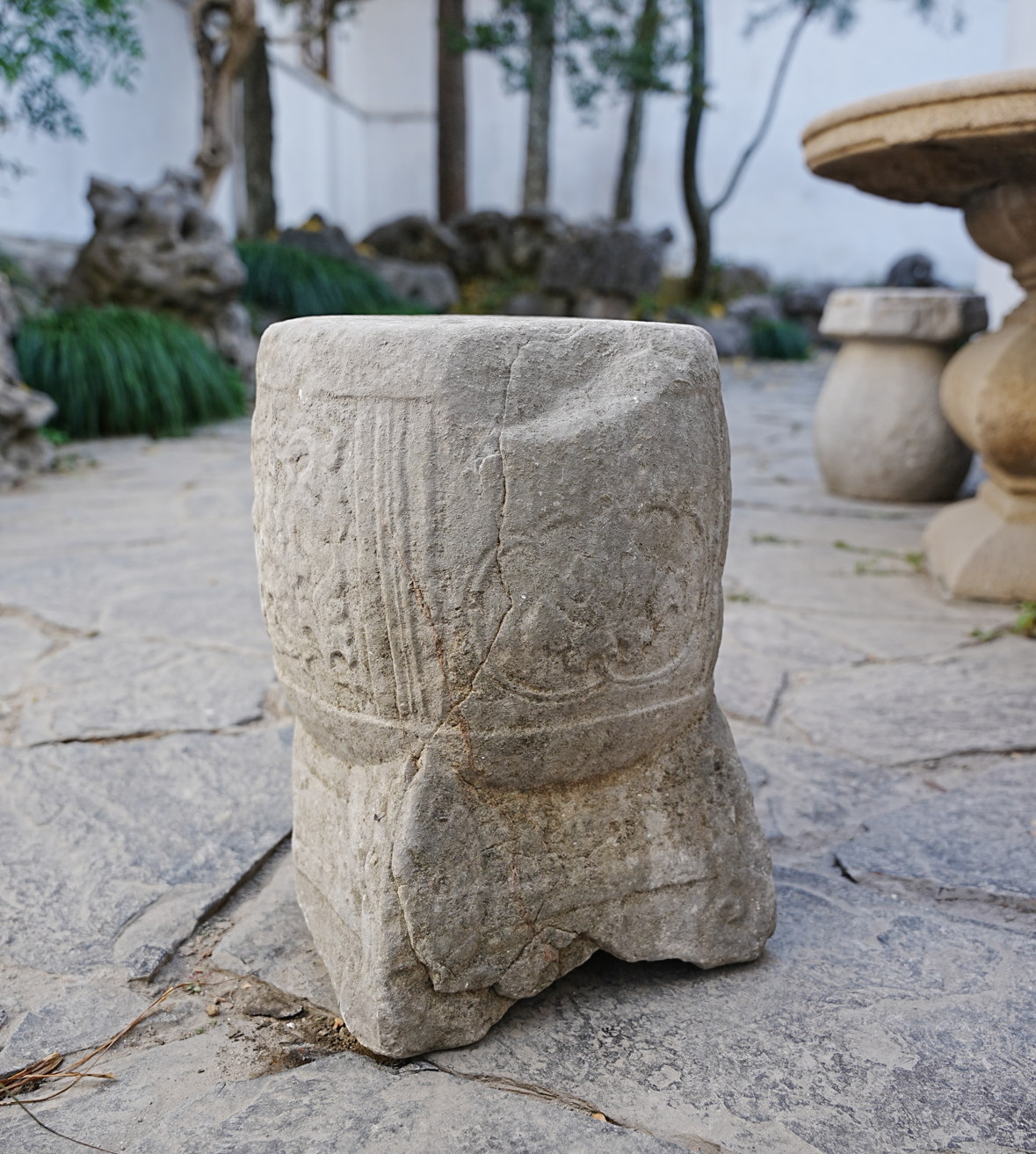 仍在给人坐的宋元石家具?苏州怡园入口附近的美麗鼓形石凳,造型为一鼓+一仿木座,鼓分四面,三面刻牡丹等纹饰,一面刻壶门,鼓座用羽毛形腿足,横枨相连。鼓凳整体造型华丽精细,或有宋元之物的可能,类似鼓凳在言子故居、苏州畅园乃至西塘等处都有,花纹形式、年代各有差。但个人认为最美,年代尚早的还是怡园这一处。 配图有些对比对象的是拿的罗汉院石柱作对比。