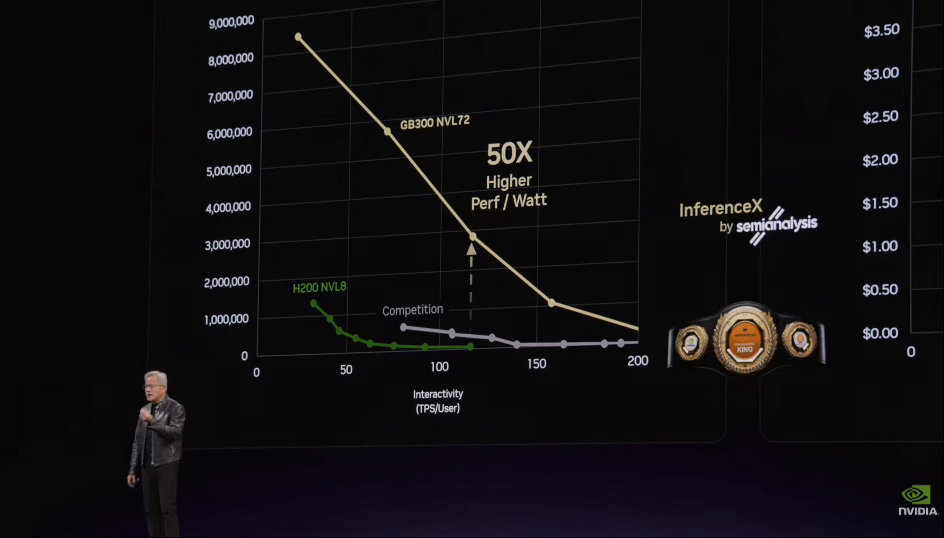 Groq 3 LPX机架搭载256个LPU处理器,提供128GB片上SRAM和640TB/s扩展带宽。LPX与Vera Rubin平台结合后,推理吞吐量/功耗比将能提升35倍。黄仁勋介绍称,LPU芯片将由三星代工,预计机架将于今年下半年开始出货。