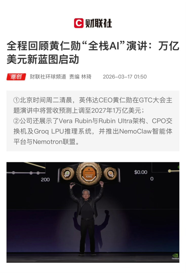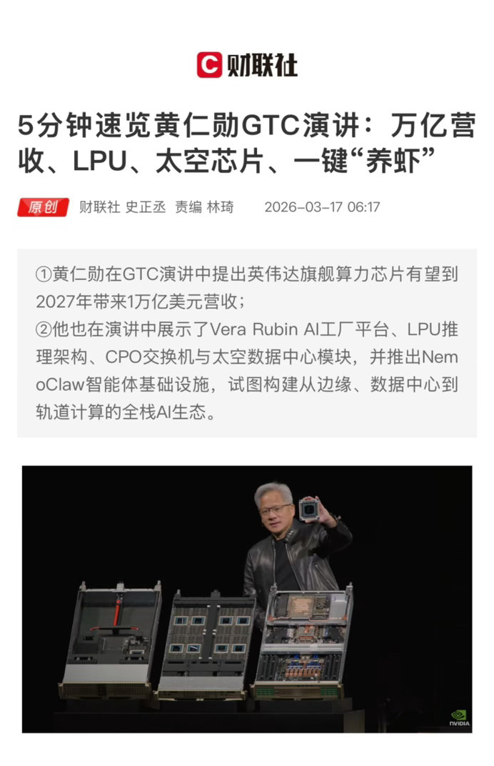 【 5分钟速览黄仁勋GTC演讲:万亿营收、LPU、太空芯片、一键“养虾”】