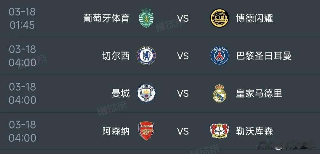 北京时间明天凌晨,欧冠1/8决赛次回合将率先展开四场争夺,其中三场都需要主队完成超级大逆转,否则就只能出局。阿森纳虽然首回合客战药厂没能取胜,但是次回合主场优势巨大,晋级在望。 葡体vs博德闪耀(首回合0-3) 葡体还有机会,翻盘的概率比切尔西和曼城要大得多,但是在主场要猛攻,而且要尽早取得进球。绝不能像国米那样,半场没能攻破闪耀哥大门。 切尔西vs大巴黎(首回合2-5) 去年的世俱杯决赛,切尔西虽然踢了大巴黎3-0,但是在欧冠赛场,再想灌卫冕冠军3个球,难度太大。只怪自己首回合踢得太差劲,罗森尼尔该好好检讨一下。 曼城vs皇马(首回合0-3) 姆巴佩和贝林厄姆双双回归,增加了曼城主场逆转皇马的难度。目前,曼城在英超也属于追赶者,球员们的状态很难保证,看瓜迪奥拉怎么整吧!在主场,曼城跟葡体和切尔西一样需要早早进球,从气势上压倒对手。 阿森纳vs勒沃库森(首回合1-1) 枪手晋级在望,主场获胜即可,但也不能掉以轻心,毕竟药厂在欧冠联赛阶段客场击败过曼城。本场还是相信阿尔特塔和他的弟子们完胜对手。
