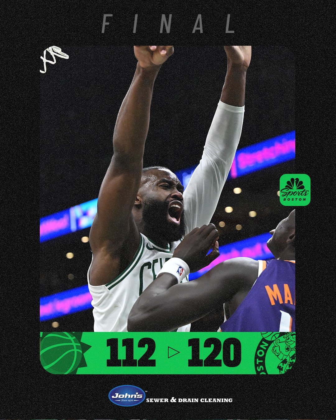 120:112主场有惊无险战胜了太阳队,全队3人得分20+,杰伦独得41分,塔图姆继续找回状态,又是一个甜蜜的主场胜利!凯尔特人热爱日记波士顿凯尔特人