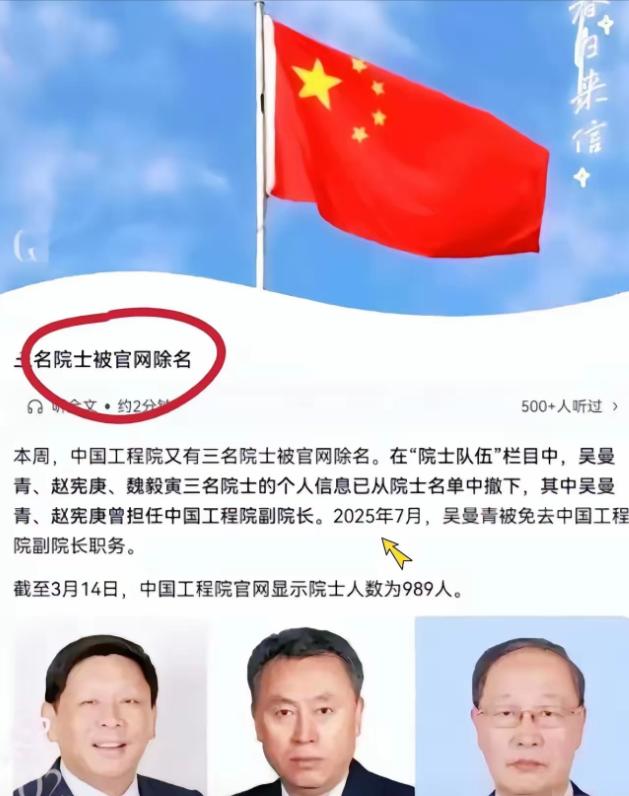 3月13号美国刚卖武器,15号咱们就除名三位院士,这时间点太硬了! 前脚美国刚宣布卖武器给台湾,后脚咱们这边,三位顶尖的国防院士就被除名了。这前后就差两天,你说巧不巧? 3月13号那天,美国那边传来消息,说他们正酝酿给台湾卖武器,而且规模不小,据说有140亿美元,里面还有爱国者三型导弹这种先进武器,路透社当天就爆料了这件事。 咱们国家外交部当天就表态了,发言人郭嘉昆明确说,中方坚决反对美国给台湾卖武器,要求美方遵守一个中国原则,停止这种破坏台海和平的行为,不过有消息说,特朗普政府怕访华前激怒咱们,还推迟了部分军售计划,看得出来,他们也不敢把事情做得太绝。 谁能想到,前脚美国刚放出要对台军售的消息,后脚就在3月15号,中国工程院官网就有了大动作 ——三位顶尖的国防领域院士,被正式从院士名单里除名了,这前后就差两天,说巧合也太巧了,任谁看了都会觉得这时间点太硬了。 被除名的这三位院士,个个都是国防领域的大人物,不是普通的科研人员。 吴曼青,以前是中国工程院副院长,还是我国数字阵列雷达理论和技术体系的奠基人,简单说就是在雷达领域,他是咱们国家的顶尖专家,对国防科技发展做过很大贡献。 赵宪庚是凝聚态和核物理学家,曾经牵头组织过咱们国家多项大型实验和国防重大任务,在核物理领域的地位很高。 魏毅寅则是导弹领域的领军人物,长期研究飞航导弹的设计和制导技术,也是国防科研的核心人才。 可能有人会问,这么厉害的三位院士,为啥会被除名?其实不是他们没做出贡献,而是院士这个称号,不只是一份荣誉,更有严格的规矩。 《中国工程院章程》里早就写清楚了,要是院士的个人行为违反了科学道德、品行不端,影响了院士群体的声誉,情节严重的,就要被劝着放弃院士称号,或者直接撤销称号;要是触犯了国家法律、危害了国家利益,那就必须撤销称号。 这三位院士被除名,肯定不是临时决定的,也不是因为一件小事,必然是经过了严格的调查和审核,确认他们的行为违反了相关规定,才会做出这样的决定。 而且近几年,国家一直在完善院士退出机制,早就打破了以前 “院士终身制” 的说法,制定了院士行为 “负面清单”,只要踩了红线,不管以前贡献多大,都要按规矩来,这就是要保证院士队伍的纯洁性,不让荣誉变成 “铁饭碗”。 很多人觉得,这两件事凑在一起,前后就差两天,不可能是纯粹的巧合,其实咱们可以好好想想,美国给台湾卖武器,本质上就是干涉中国内政,危害咱们国家的主权和安全,而国防院士是咱们国家国防科研的核心力量,肩负着研发国之重器、守护国家安宁的责任。 咱们一边坚决反对美国的挑衅行为,维护国家主权;一边严格整顿内部队伍,把不符合规矩的院士除名,这其实是在传递一个明确的信号:不管是对外,还是对内,咱们都要守住底线。 对外,绝不允许任何国家干涉中国内政,破坏台海和平;对内,要保证国防科研队伍的过硬,只有内部队伍干净、有纪律、有担当,才能研发出更先进的国防科技,才能真正守住国家的安全。 可能有人会说,这会不会是故意选在这个时间点,回应美国的军售?其实不一定是刻意安排,但这个巧合的时间点,反而更能体现咱们的态度。 美国想通过对台军售挑衅咱们,而咱们用整顿国防队伍、坚守内部规矩的行动,表明咱们守护国家主权和安全的决心,不管外部怎么挑衅,咱们都会做好自己的事,既要反对外来干扰,也要筑牢内部根基。 这三位院士虽然曾经有过贡献,但规矩就是规矩,不管是谁,只要违反了,就必须受到处理。这也告诉大家,院士不是 “免罪金牌”,荣誉越高,责任越大,一旦辜负了国家和人民的信任,就会被依法依规处理。 而美国的对台军售,不管他们怎么推迟、怎么掩饰,本质上都是在破坏台海和平,都是在干涉中国内政,咱们的反对态度从来都没有变过。 这次两件事凑在一起,虽然时间上巧合,但背后都是咱们守护国家主权、筑牢国防根基的决心,不管外部有多少干扰,咱们都会坚定不移地做好自己的事,守护好自己的国家。