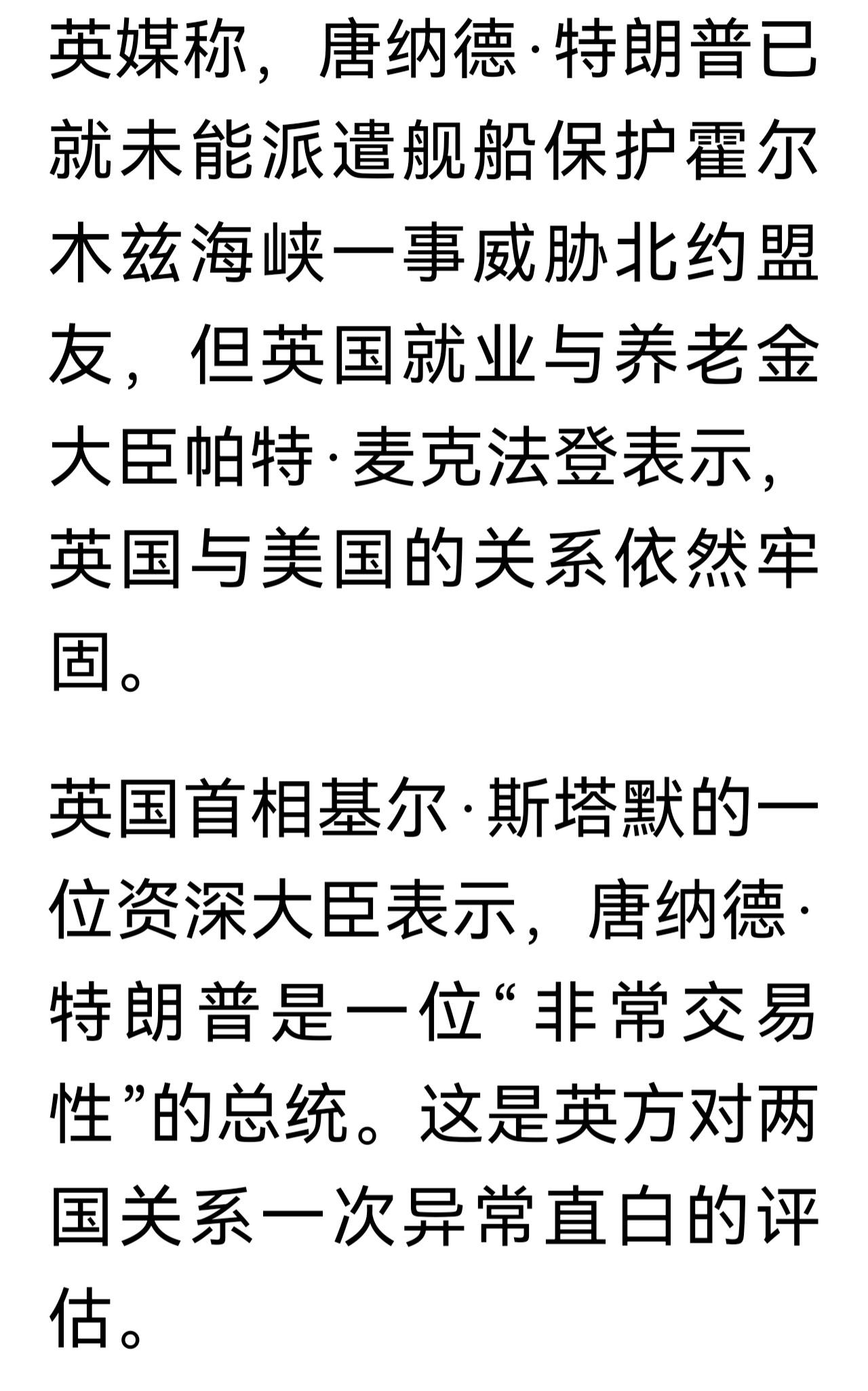 如此直白评论特朗普,也就是英国大臣可以,用他们自己的话说,关系牢固,不怕翻脸,其实话里有话,任期。 英国媒体报道,英国就业与养老金大臣帕特.麦克法登说“特朗普是交易性总统,我们没义务支持他每项要求”。 它是针对特朗普抱怨盟友没有支持他在霍尔木兹海峡护航的请求后,威胁减少对盟友军事支持接受采访时说的。 如此直白,非常的坦诚,估计也是应对了特朗普,非常的坦诚,因为特朗普对战争好像是特别上心,不是他平息了战争,主持了正义和平到来的伸手要诺贝尔和平奖,就是他自己发动战争信心满满,到处炫耀赢了赢了,摧毁了伊朗的海军、空军、导弹和核设施,觉得非常的开心,他炸哈尔克岛也非常开心,炸死了伊朗的几十位领导层,他也非常开心,让人们觉得这一个80岁的总统像个8岁小孩的心血来潮一样,确实坦诚。嗜血如狂的老头儿,还想强迫别国和他一起惹上战火,这智商写在脸上,就是对美国在选举中投他票的人一种侮辱。 你喜欢他吗?