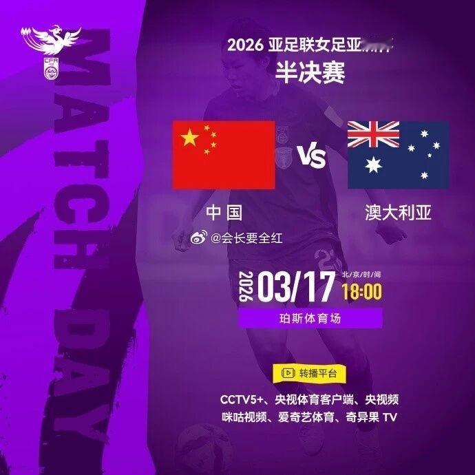 今日18点,女足亚洲杯 半决赛在珀斯体育场上演,中国女足对阵东道主澳大利亚女足。