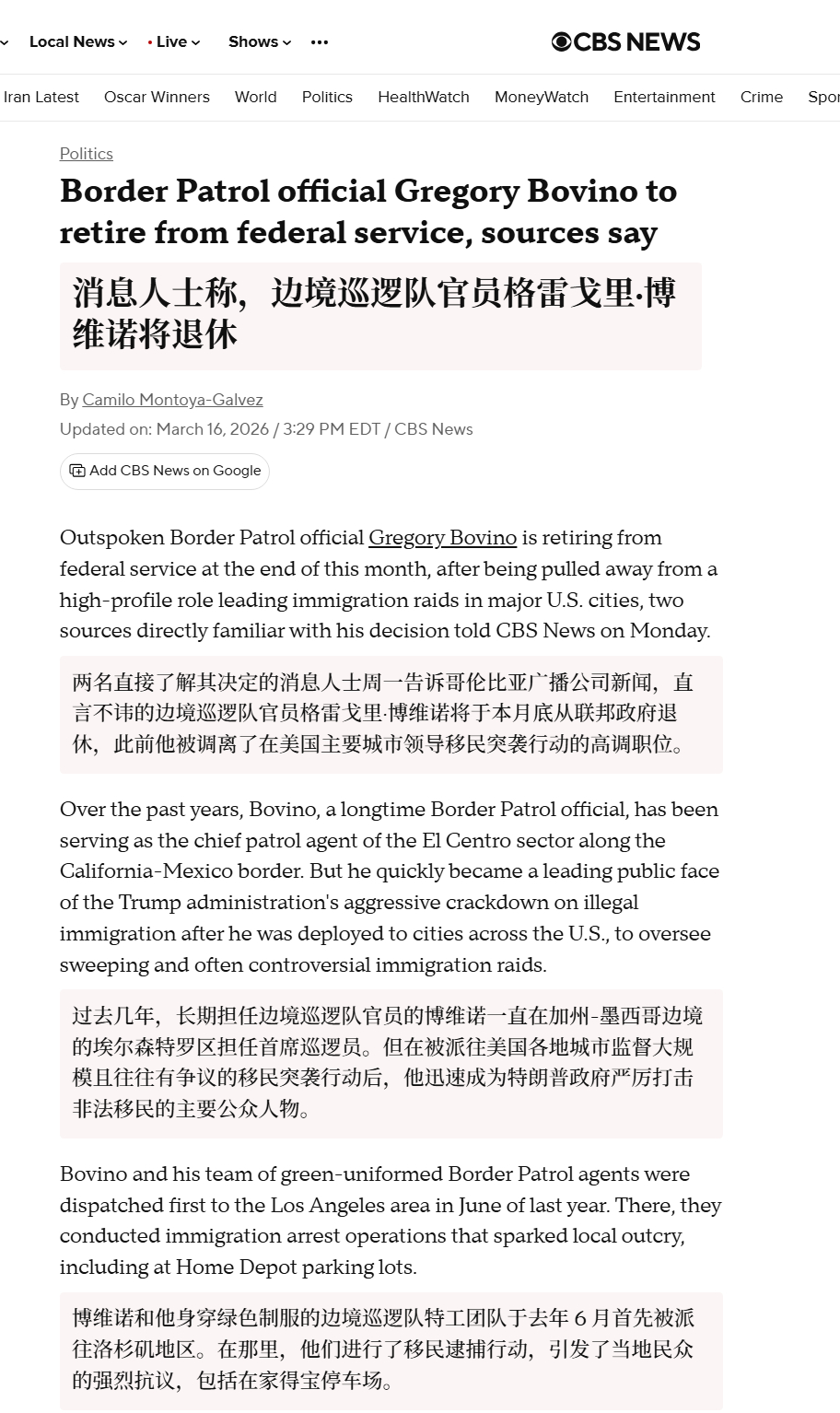 🔻哥伦比亚广播公司:格雷格·博维诺将于本月底从美国联邦政府退休。🔻对于这位在特朗普政府执政第一年被授予巨大权力的美国官员来说,这真是一场迅速的垮台。🔻他的恩主、美国国土安全部前部长克里斯蒂诺姆都已经滚蛋了,当特朗普团伙的狗就是这样的下场。🔻最近 ICE 整活的新闻都少了。海外新鲜事 热点现场