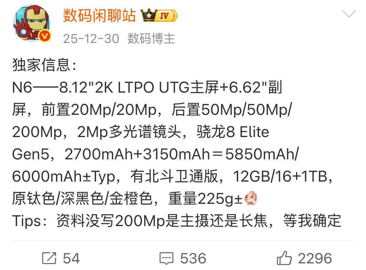 8.12"2K+120Hz LTPO UTG三星E7主屏+6.62"120Hz LTPO京东方Q10副屏,无痕铰链设计;前置20Mp/20Mp,后置200Mp HP5主摄+50Mp JN5超广角+50Mp JN5潜望长焦微距+2Mp丹霞原彩镜头;骁龙8 Elite Gen5,6000mAh+80W+50W无线充,66频段+北斗卫通,IP56/IP58/IP59,8.93mm/225g