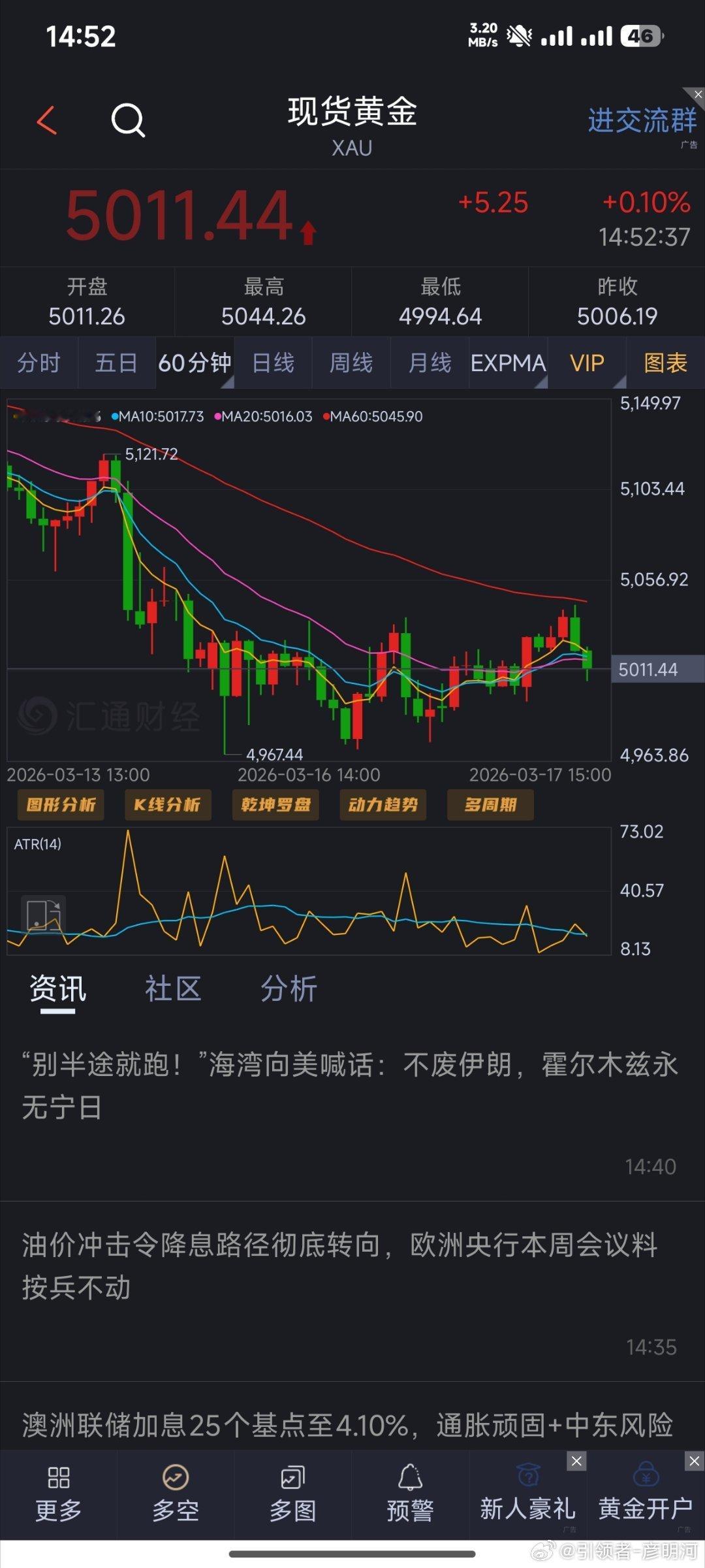 第一次入场:黄金5011空,目的地4990(个人观点,仅供参考!)