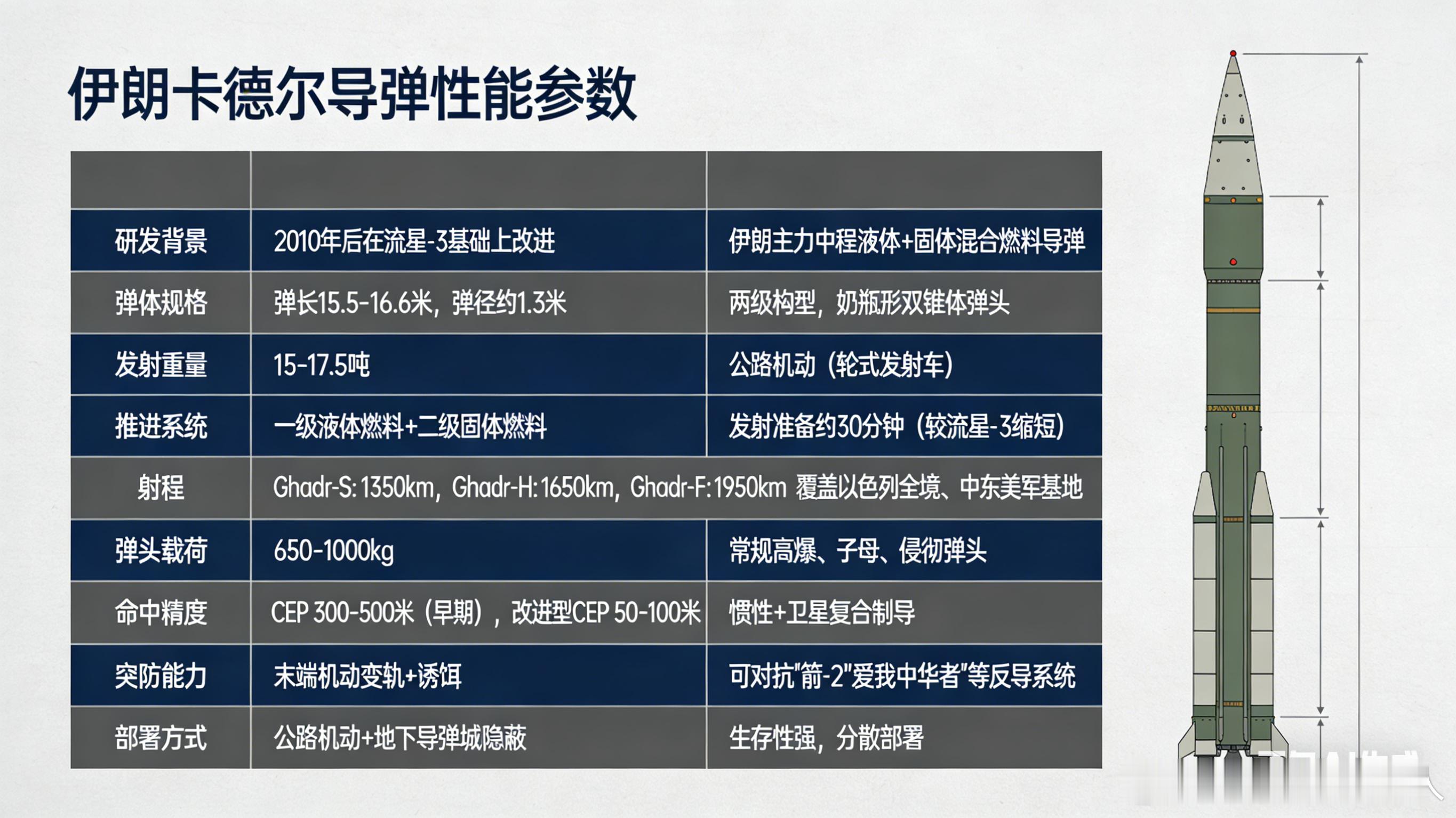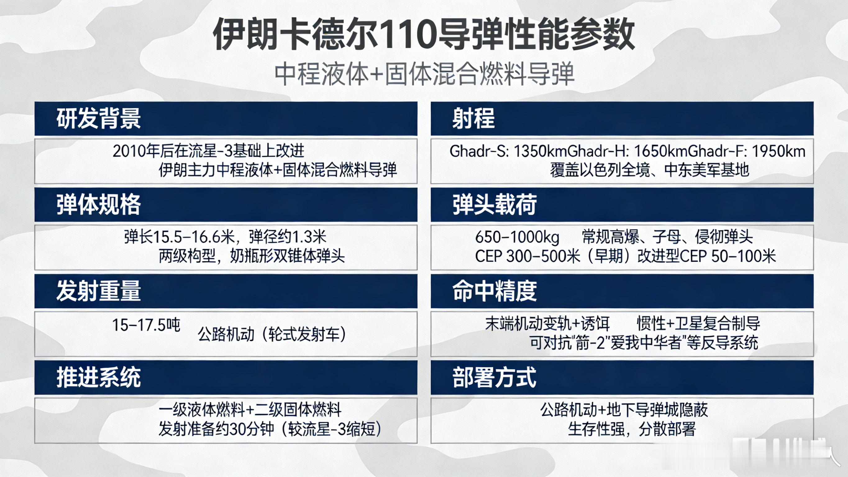 ✅ 核心型号&性能(以Ghadr-110为主)🔹 研发:2010年后改进自流星-3,主力混合燃料中程导弹🔹 规格:弹长15.5–16.6米,发射重量15–17.5吨,公路机动部署🔹 推进:一级液体+二级固体燃料,发射准备约30分钟🔹 射程:1350–1950km(分3个型号),覆盖以色列及中东美军基地🔹 战力:弹头载荷650–1000kg,改进型CEP 50–100米,可对抗“箭-2”“爱国者”反导