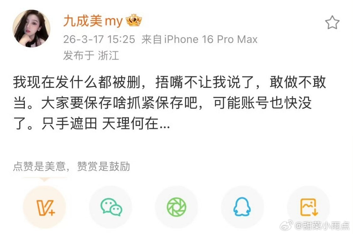 九成美秒删这个时候捂嘴是不是有点晚了,我一直觉得田栩宁的公司像是把他放弃了,嘿热搜从来没管过,最著名的就是上次的孩子热搜挂了两三天🥲这次热搜更是源源不断…姐姐,不像田雷删的,他没这个实力!听懂的都小猪佩奇了