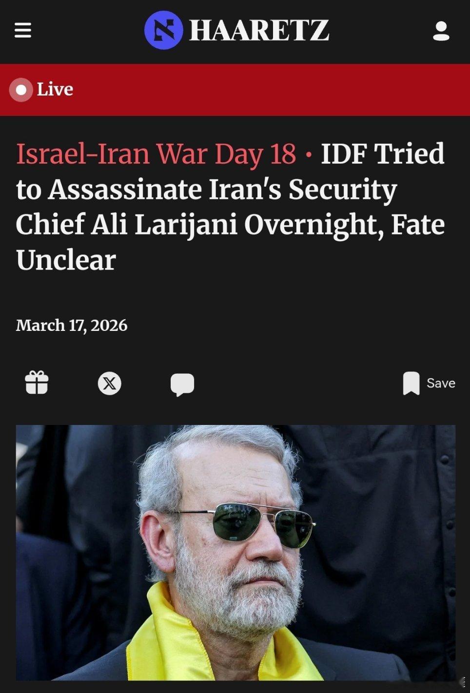 以色列刺杀拉里贾尼以色列-伊朗战争第 18 天:以色列国防军试图暗杀伊朗安全事务负责人阿里·拉里贾尼,当晚行动未果,结果尚不明朗。(以色列国土报)