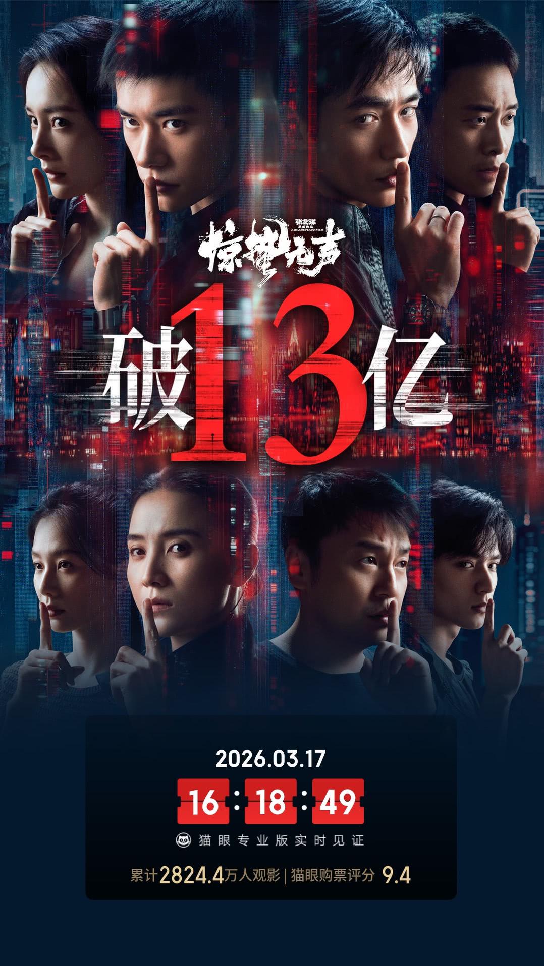 《惊蛰无声》票房破13亿,宋佳主演电影累计票房破百亿。 由张艺谋执导,易烊千玺、朱一龙、宋佳领衔主演,雷佳音、杨幂主演,张译友情出演,刘诗诗、刘耀文特别出演的春节档谍战题材电影《惊蛰无声》,累计综合票房破13亿,超越《摔跤吧!爸爸》、《年会不能停!》、《无双》、《人再囧途之泰囧》、《捕风捉影》等片,进入内地影史票房总榜89强;超越《西游降魔篇》、《封神第二部:战火西岐》,进入春节档历史26强。 不出意外的话,这也是《惊蛰无声》跨过的最后一个亿元线。 在《惊蛰无声》的助力下,宋佳主演电影的内地累计票房已成功突破100亿大关,是继马丽、周冬雨、佟丽娅、张小斐、白百何之后第6位达到这一成绩的华人女演员。
