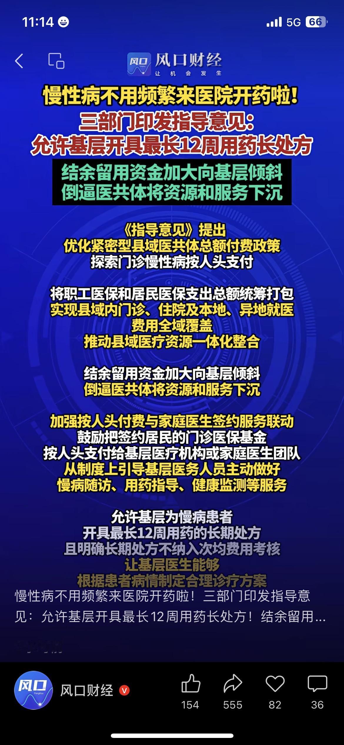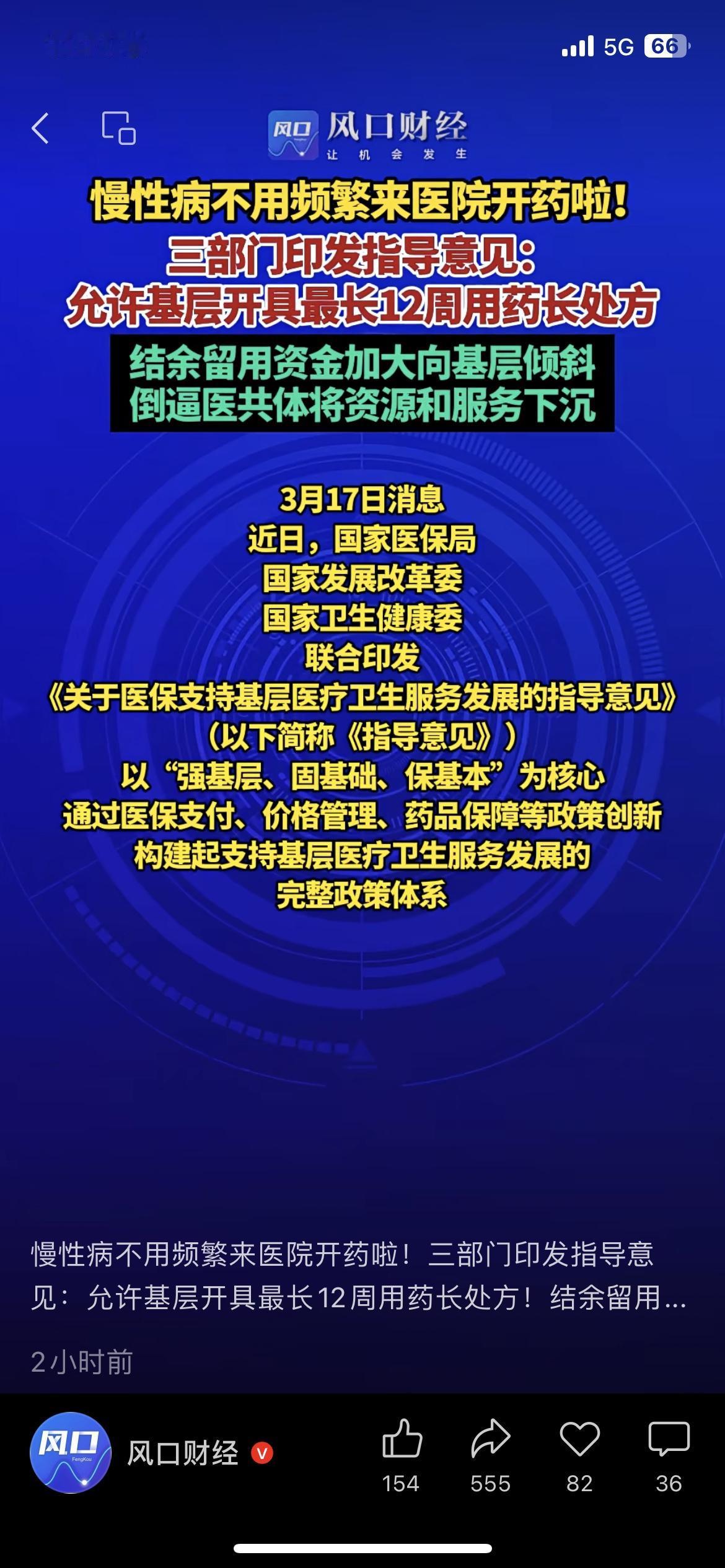 好消息!慢性病不用每月跑医院了,基层可开12周药 三部门重磅发文:基层可开最长12周慢性病长期处方,且不纳入次均费用考核! 配套福利:职工/居民医保门诊报销不低于50%,结余资金向基层倾斜,家门口药更全、结算更快。 👉 真实实惠: 我家楼下李叔高血压,以前半个月跑一次大医院,现在社区医院直接开3个月的药,省时间又省路费。 看病更方便,花钱更少,实实在在的民生红利! 慢性病 医保新政 基层医疗