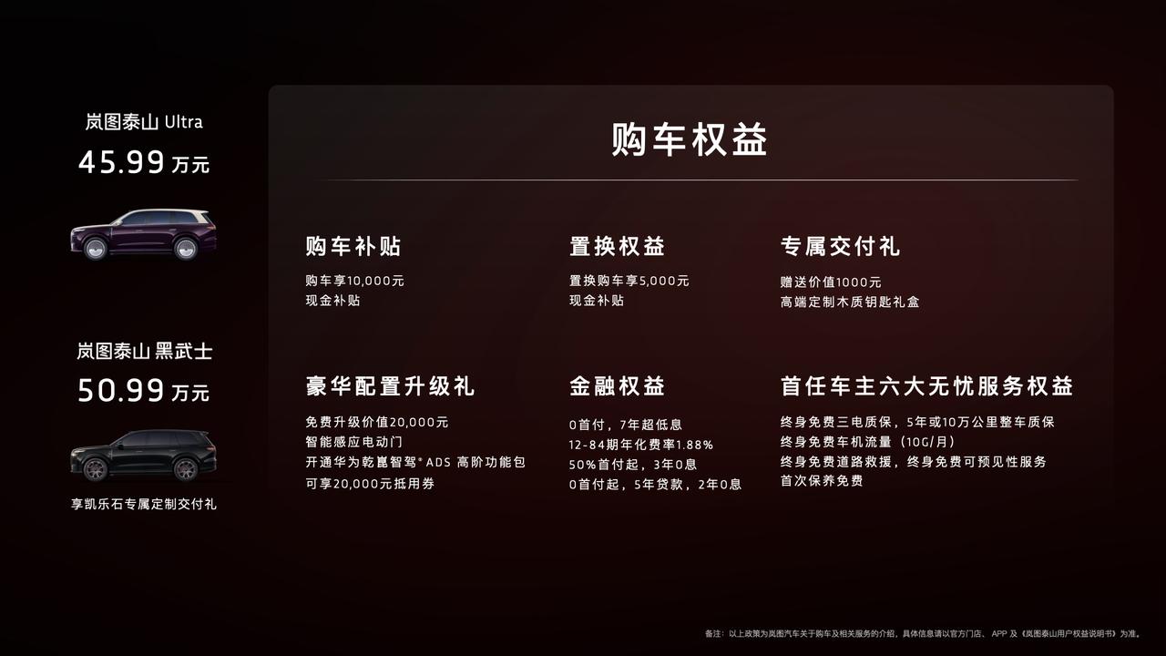 岚图泰山Ultra正式上市,45.99万起!搭载华为896线激光雷达,120米外识别14cm小目标,34颗感知硬件织就360°守护网,L3级有条件自动驾驶量产落地。五大冗余+华为乾崑智驾ADS 4.1+魔毯底盘稳如泰山,65度大电池+5C超充,-40℃极寒无忧,试驾车已到店,可以亲自感受一下喔。