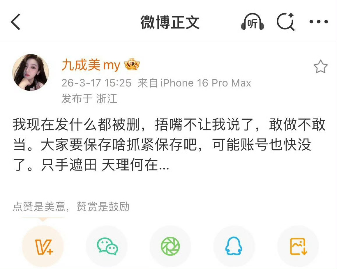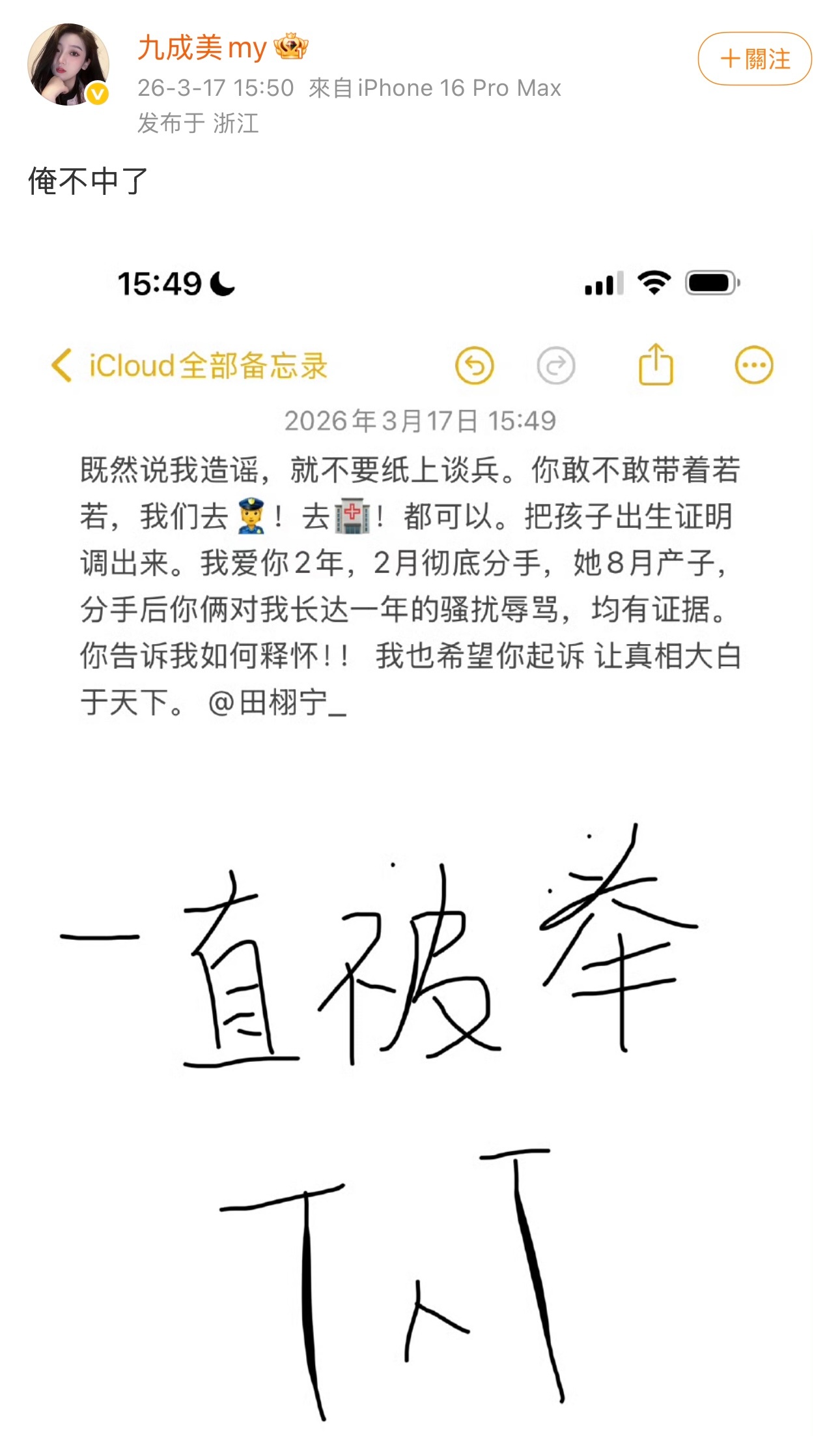 九成美秒删九成美发文称自己一直被举报,被大公司捂嘴,她称自己愿意跟田栩宁和若若一起去调取出生证明,对于两年两个月的恋情以及对方女友八月生子,以及分手后这对情侣对自己长达一年的辱骂均有证据,愿意接受起诉,让真相大白。天呐九成美完全不怕被起诉,大家怎么看?