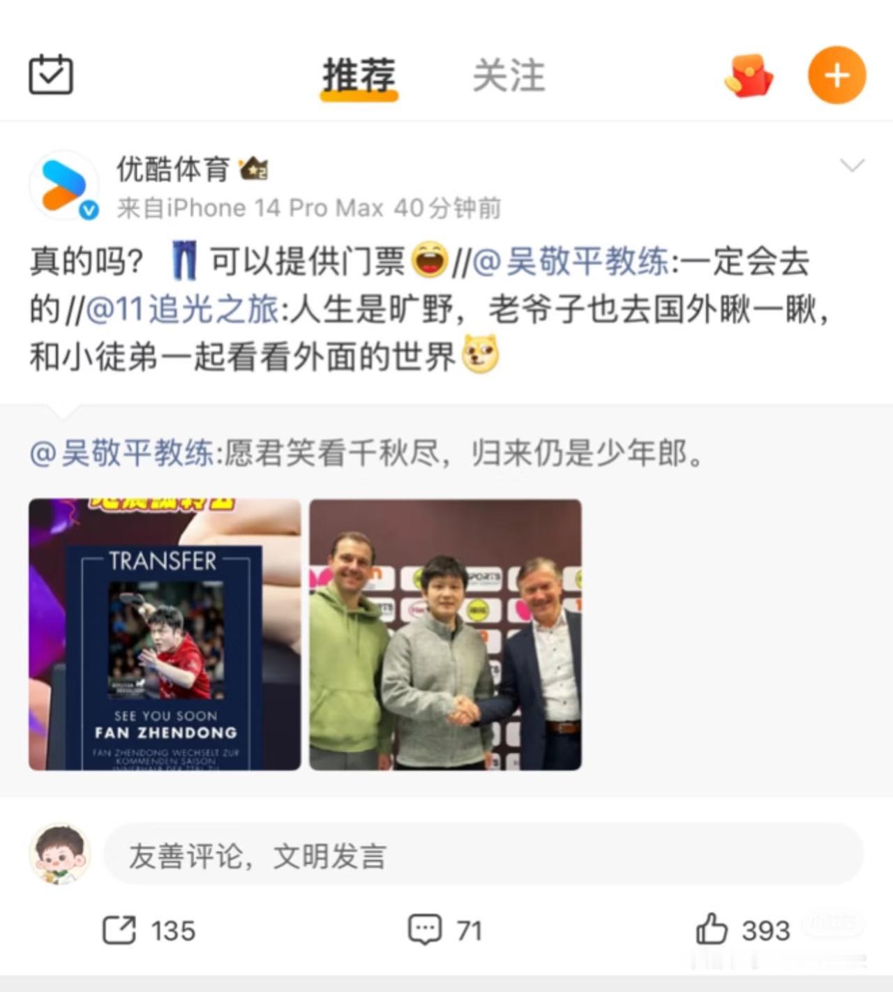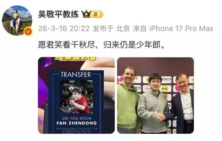 吴敬平教练寄语樊振东转会:愿君笑看千秋尽,归来仍是少年郎! 樊振东算是吴敬平最小的关门弟子, 爱可以跨越山海, 跨越岁月, 吴门有超级全满贯, 也可以有闪耀欧洲的乒坛巨星! 吴敬平教练当年在古市给樊振东 买了一块玉, 当真是当儿子一样疼爱! 每一次看吴敬平教练的寄语, 都莫名的感动🥹! 感觉吴教练只希望樊振东快乐就好, 一个是王涛教练, 一个是吴教练, 都是樊振东乒乓球职业生涯中的 伯乐,是一直挂念东哥的人, 樊振东更是让吴教练骄傲的弟子……