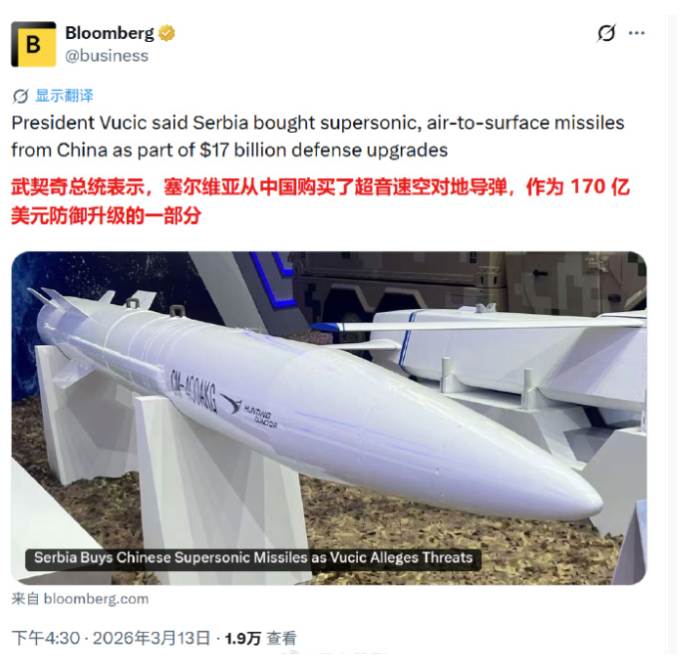 2026年3月12日晚,塞尔维亚总统亚历山大·武契奇在国家广播公司RTS的镜头前,平静地确认了一个让布鲁塞尔和华盛顿心头一紧的事实:塞尔维亚空军已经装备了中国制造的CM-400AKG超音速空地导弹。