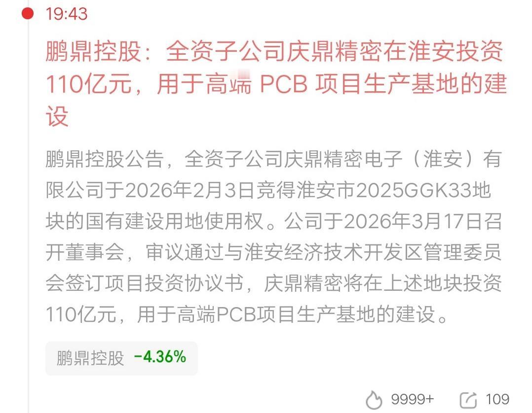 财运来了挡都挡不住呀,公司突发核弹级利好,7.55万股东可能要吃大肉了。鹏鼎控股:全资子公司庆鼎精密在淮安投资110亿元,用于高端 PCB 项目生产基地的建设。 我们来分析一下,110亿的投资额,可以说是超级大手笔了。敢投资这么多钱,必然是看到了确定性的市场需求,而且极有可能客户已经谈妥了。高端PCB需求最旺盛的行业,就是AI算力和汽车电子,也是技术壁垒最高的。 2025年公司营收391亿多,利润37亿多。新项目在未来会贡献丰厚利润,这需要多年才能兑现。 目前股价处于高位,风险很大了,所以不要追高,以免山顶站岗。