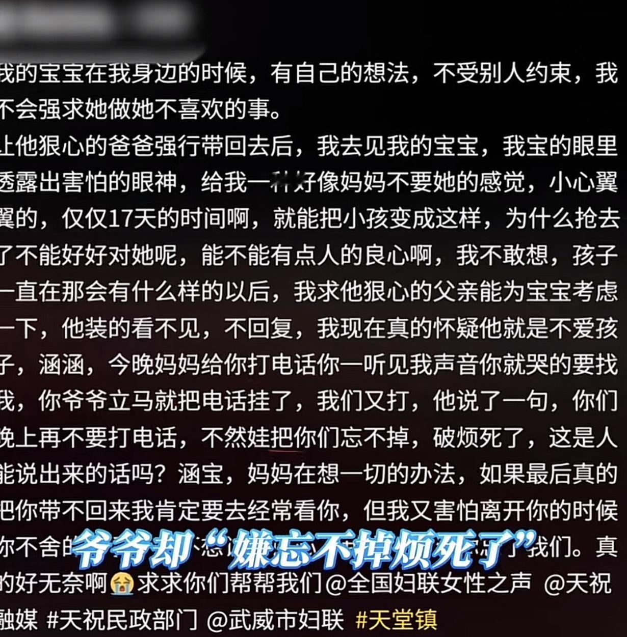 在姥姥家被宠成宝,去爸爸家却成了留守儿童,三岁的涵涵真的太让人心疼了。 涵涵一岁时母亲生病走了,留下了还在襁褓之中的涵涵,父亲因为不想照顾就将她送到姥姥家代为照料。 在姥姥家,全家人都将她当成宝贝一样宠着,两个小姨会给她扎漂亮的羊角辫,穿好看的裙子去各个城市旅游,精心照顾着姐姐留在世间唯一的女儿,将她养的干干净净,活泼开朗。两个姨夫也把涵涵当亲生闺女一样疼,姥姥姥爷更是把她捧在手心。 涵涵就在这样满满的爱里长大,原本她可以幸福快乐过完这一生,然而谁也没想到涵涵3岁时,他的父亲突然将涵涵带走,带走后直接将放在农村老家不管了,自己跑到外面潇洒,家里只有七十岁的爷爷奶奶,根本无法好好的照顾涵涵。 涵涵离开后,姥姥和小姨整日思念涵涵,最后实在忍不住开车去看涵涵。没想到仅仅过了17天,她们再见面时,原本白白胖胖的涵涵现在面黄肌瘦,穿着脏兮兮的衣服,头发乱糟糟的没人梳,衣服上沾着干饭渍,小手黑黢黢的,指甲缝里全是灰,与之前在姥姥家的模样简直是天差地别,看着之前在自己宠的好好的掌心宝贝变成这番模样,小姨心都快碎了。 看到小姨来了,涵涵想上前找小姨,但奶奶却抱着不撒手,于是涵涵拼命挣扎,直到她扑到小姨身上所有的委屈一下子涌了出来,直接哭了出来。看着变成这样的涵涵,小姨满眼都是心疼。而她的奶奶看到小姨来专门喊邻居盯着,生怕她们把孩子带走回去过好日子。即便涵涵哭到嗓子都哑了,也只能眼睁睁看着小姨被赶走,自己只能继续留在陌生地方。之后小姨的网名都改成了涵涵三姨等你回家,并发帖向广大网友们求助,帖子里字字句句都是牵挂和心疼。 既然给不了孩子贴心的照顾,又为什么要带走她呢?孩子的世界多简单,只想要有人疼有人爱。真的希望涵涵能早日回到姥姥和小姨身边,重新做回那个被所有人宠着、无忧无虑的小宝贝。