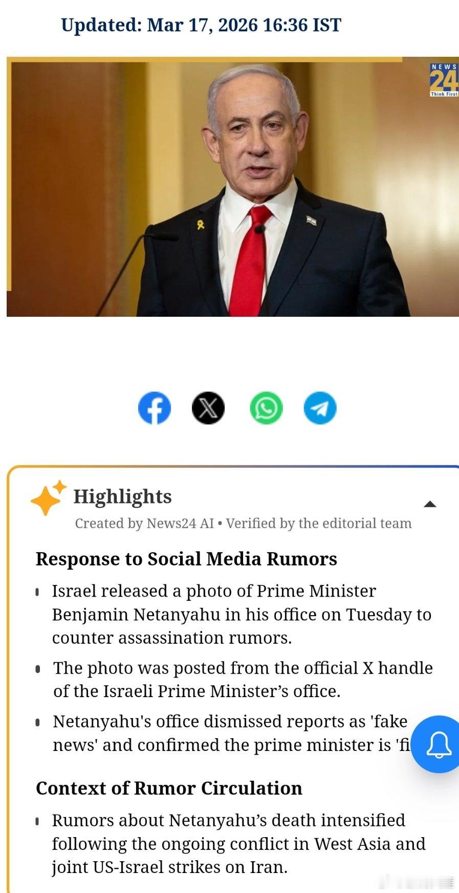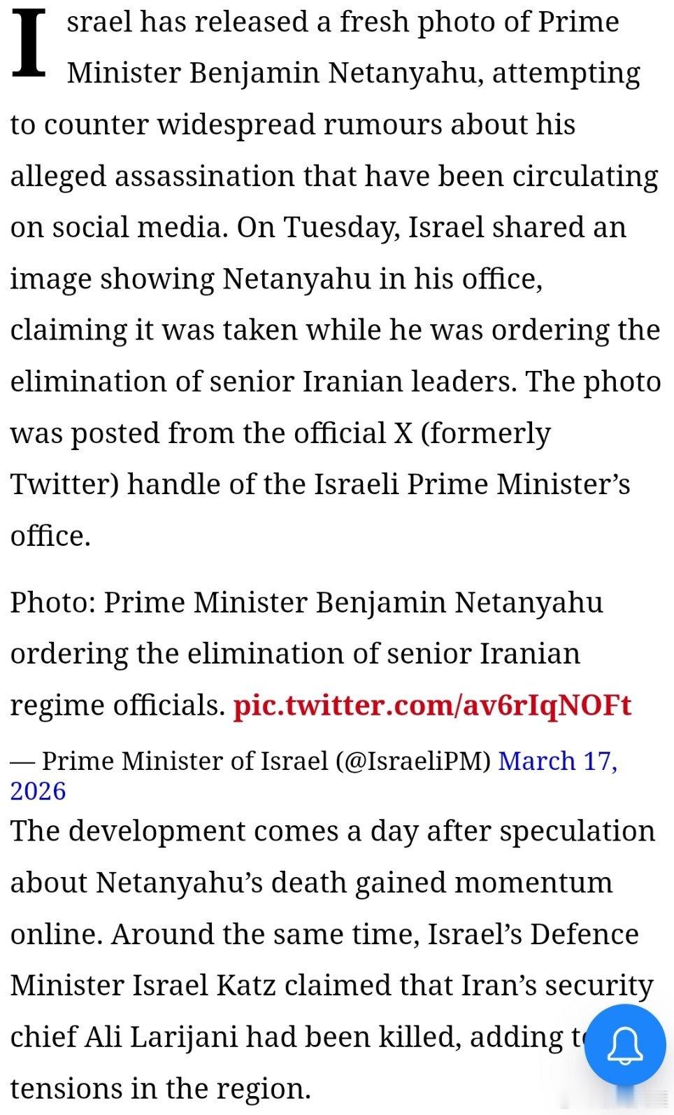 周二,以色列公布了一张照片,照片中显示内塔尼亚胡正在办公室内,声称这是他在下令消灭伊朗高级领导人时所拍摄的。这张照片是从以色列总理办公室的官方 X(原名推特)账号上发布的。(印度时报网)