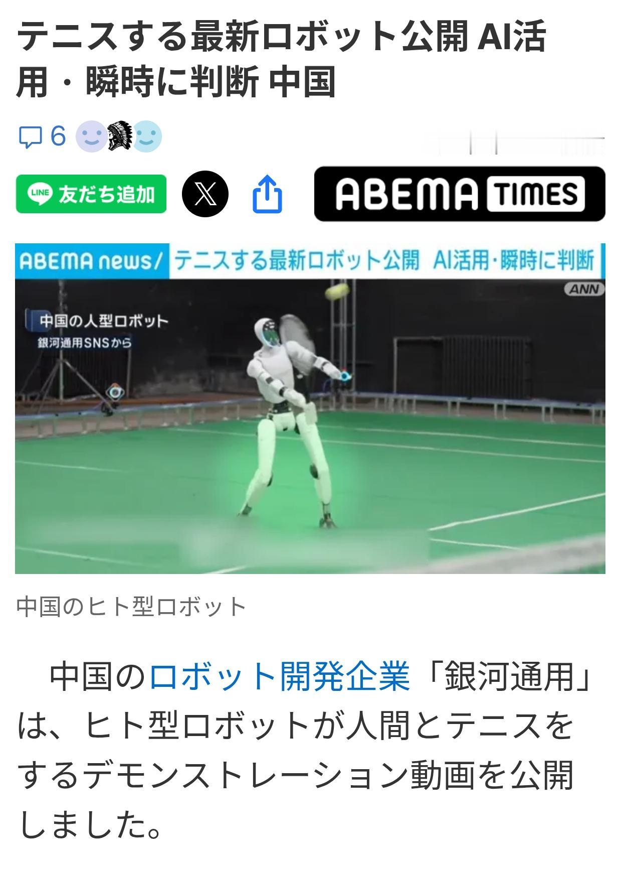 日媒:中国能打网球的机器人 3月17日《日本新闻网》刊载:中国机器人开发企业“银河通用”发布了一段演示视频,展示了一台人形机器人与人类打网球的视频。 一台手持球拍的人形机器人一边移动步伐,一边击打人类发来的网球。 据“银河通用”介绍,机器人利用基于人类网球运动员训练数据的人工智能,能够即时自行判断并控制动作,而非预设程序的动作。 这项技术是与中国清华大学合作开发,以此展示机器人正从'机械运动的重复'迈向'智能决策和反应'。” 中国宣布增加科技投资,使人工智能和机器人产业成为经济发展的新支柱,技术开发接连不断推进。 (ANN新闻) 日本网名的评论: “我好喜欢会跳舞和打球的机器人”。 “这是中国的,肯定里面装了一个人”。 人形机机器人