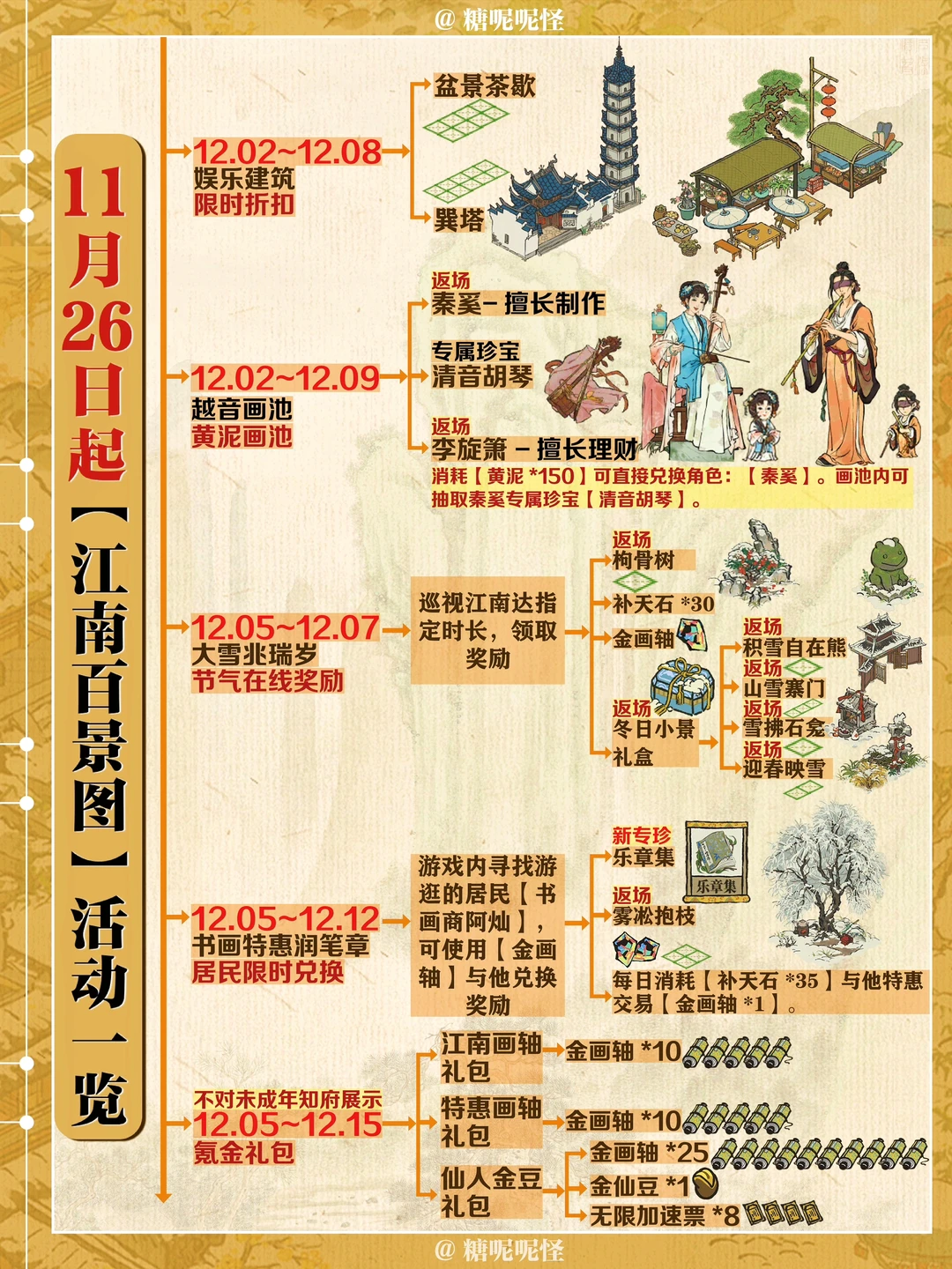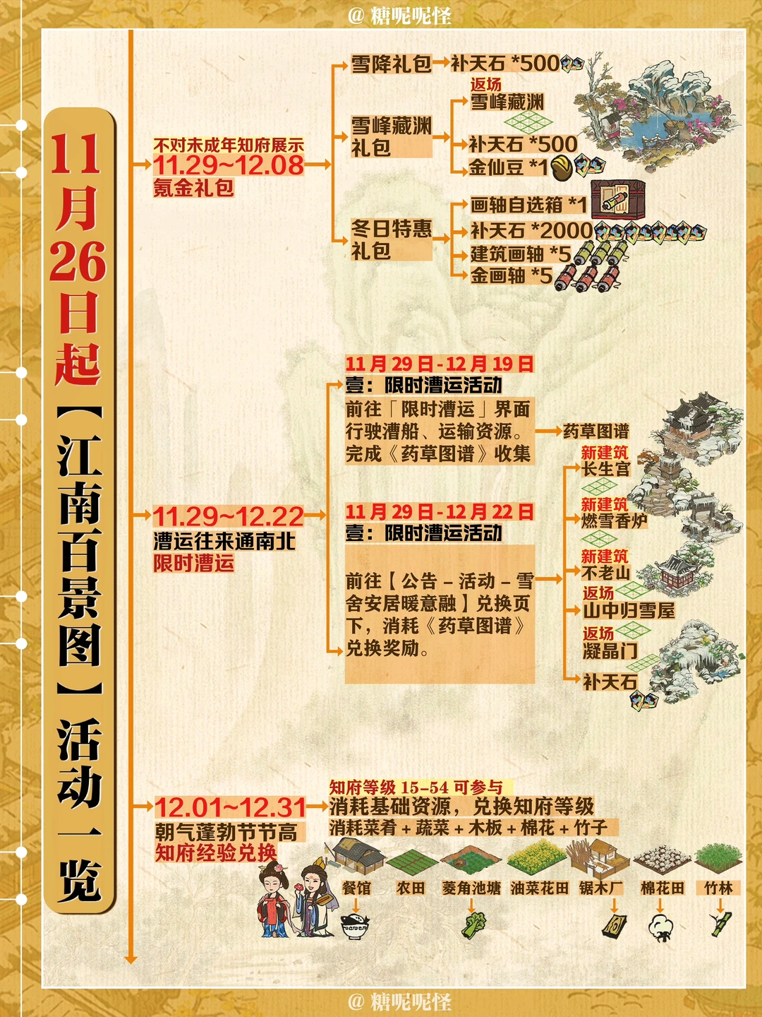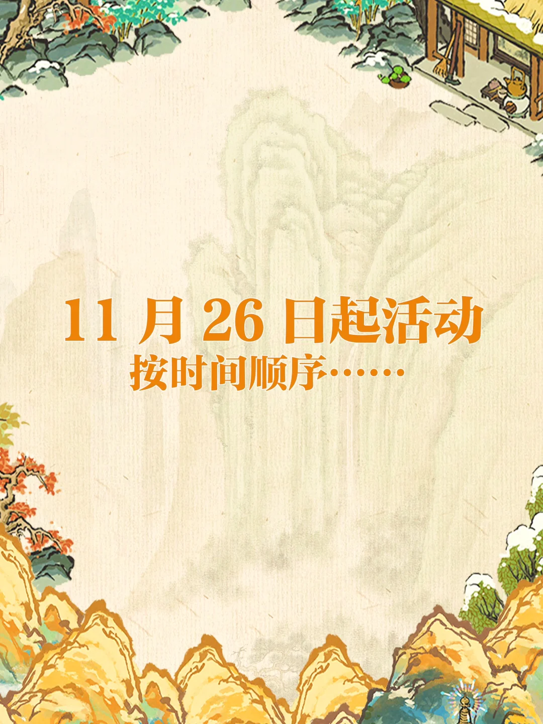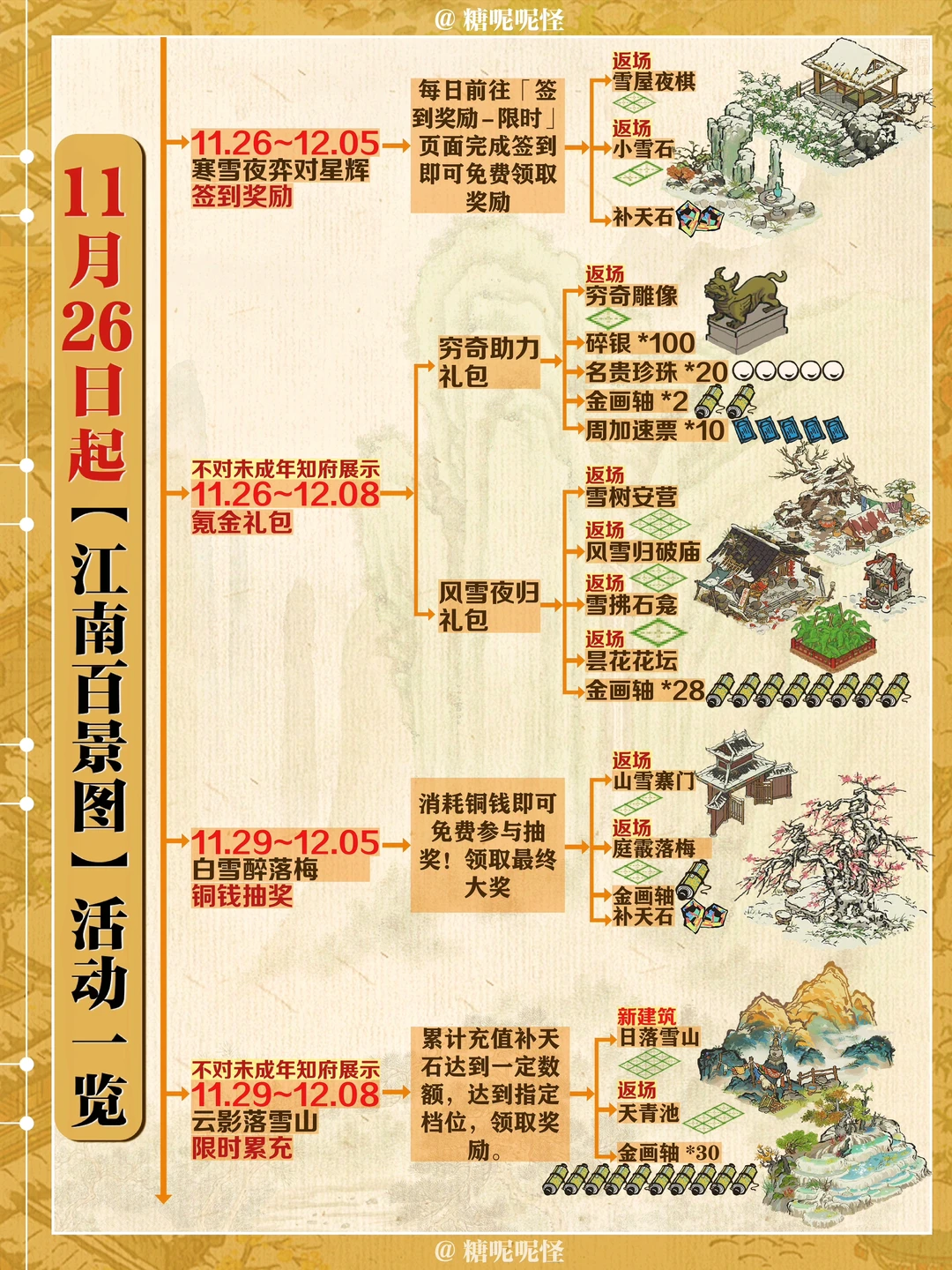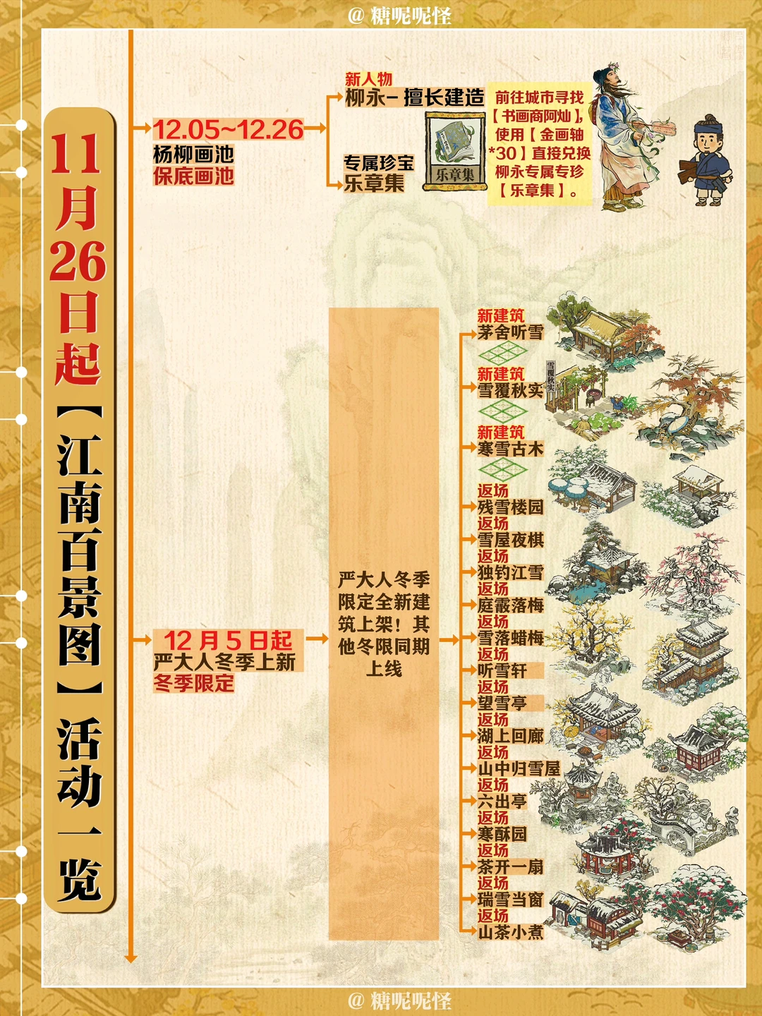 1️⃣新人物:柳永 2️⃣新建筑:【日落雪山】【长生宫】【不老山】【燃雪香炉】【茅舍听雪】【雪覆秋实】【寒雪古木】 3️⃣返场人物:【秦奚】【李旋箫】 4️⃣返场建筑:所有严大人冬季限定建筑【积雪自在熊】【山雪寨门】【小雪石】【迎春映雪】【风雪归破庙】【雪峰藏渊】【雾凇抱枝】【雪树安营】【天青池】【凝晶门】