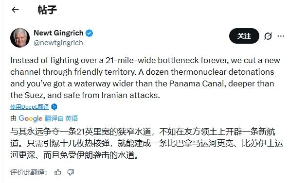 铁杆盟友给特朗普支招:与其关注霍尔木兹海峡,不如用核弹炸出一条新运河 眼看特朗普无法体面地结束对伊朗的战争,有人开始拱火了。美军基地遭袭画面曝光 16日,美国前众议院议长纽特·金里奇在社交媒体上给特朗普“支招”,称特朗普与其把目光放在争夺霍尔木兹海峡上,不如在阿拉伯半岛上“修建”一条新运河,“只要投放十几枚热核武器,就能炸出一条比巴拿马运河更宽、比苏伊士运河更深,且能免受伊朗攻击的新航道。” 纽特·金里奇一直被外界视为特朗普“最坚定的支持者”之一。2016年大选期间,他曾担任特朗普的竞选顾问,甚至一度成为副总统的热门人选。 然而,就他当天的发言来看,很难想象这是出自特朗普一位铁杆政治盟友之口:特朗普的支持率本就因美伊战争陷入泥潭而暴跌,金里奇这番“核武器修运河”的惊人之语,非但无助于让特朗普尽快从中东脱身,反而可能加剧美国民众对特朗普的负面印象——在这条推文的评论区,已有不少美国网友和媒体人对这一疯狂想法破口大骂。 即使从现实角度考量,金里奇这个提议也毫无可行性。霍尔木兹海峡南岸的阿曼/阿联酋一侧是海拔2000到3000米的山脉,绝非“十几枚核弹”就能炸平。 金里奇这番话倒挺符合外界对某些美国政客的刻板印象:地理常识为零,张口就来——也不知道金里奇是太想帮特朗普的忙,还是太想看他出洋相。