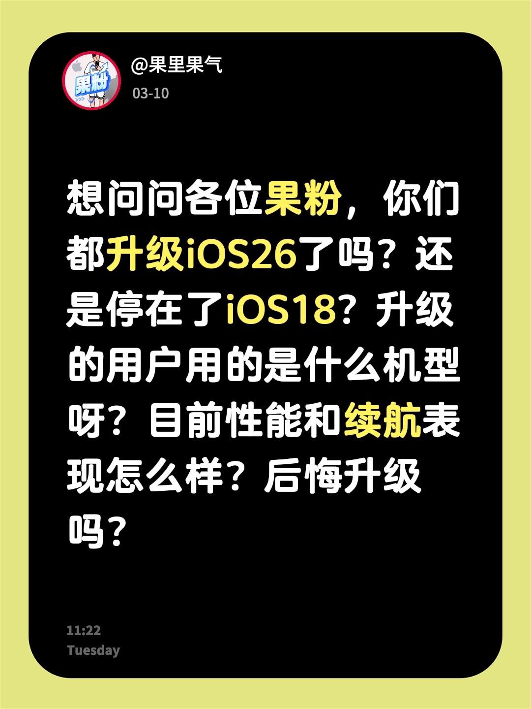 想问问各位果粉,你们都升级iOS26了吗?还是停在了iOS18?升级的用户用的是什么机型呀?目前性能和续航表现怎么样?后悔升级吗?