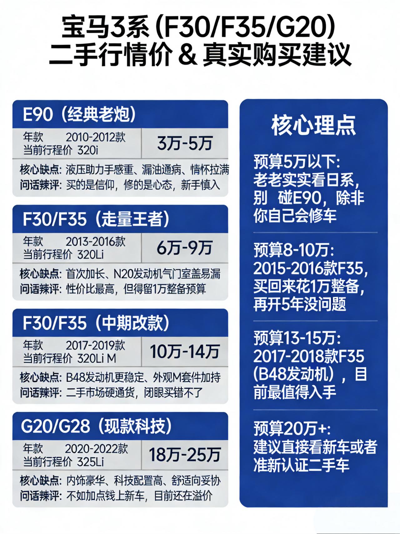 宝马3系,多少男人的“绕不开”如今成了“真香”? 说实话,每次有人问我“二手宝马能买吗”,我第一反应都是反问:你准备好和修车师傅做朋友了吗? 这不是开玩笑,德系车尤其是宝马,过了6-8年,漏油漏水几乎是必修课。但为什么还是有那么多人前赴后继?因为那份驾驶质感,是真的“有毒”。 1. 关于“绕不开”的执念 很多人说“每个男人都绕不开一台3系”,这话听着像营销文案,但开过的人懂。哪怕是最入门的320i,那个转向手感、底盘反馈,尤其是过弯时那种“人车合一”的感觉,是凯美瑞、雅阁给不了的。 但执念需要买单。 这个“单”可能是时间——你得接受它偶尔亮故障灯;也可能是金钱——整备费用得提前准备好。买二手宝马,最忌讳的就是“预算卡死,不留余地”。花12万买车,结果变速箱漏油修一万,那才是真难受。 2. 不同年款,天差地别 很多人一听宝马3系,就觉得是老车、毛病多。其实3系内部的分化特别大: · E90时代(2005-2012): 这是真正的“驾驶者之车”,但也是维修厂的VIP。那个液压助力转向,沉到练麒麟臂,但路感清晰得能数清柏油颗粒。现在3-5万就能圆梦,但你要做好“不是在修车,就是在去修车路上”的心理准备。适合有情怀、有手艺、有备用车的玩家,普通人千万别碰。 · F30/F35前期款(2012-2016): 这代首次加长,后排空间直接起飞。但N20发动机有个通病——气门室盖漏油,几乎每台都逃不掉。不过换个盖也就两三千,整备完又是一条好汉。目前6-9万的价格,确实是预算有限又想圆梦3系的首选。 · F30/F35后期款(2017-2019): 这代换装了B48发动机,稳定性提升了一大截,漏油问题大大改善,再加上M运动套件,外观到现在看也不过时。目前行情10-14万,相当于新车落地价的4折左右,是现阶段最值得入手的3系。开个三四年,还能卖个七八万,折损率算下来比买新车划算多了。 · G20/G28(2019至今): 这代内饰豪华了、底盘舒服了、科技配置也跟上了,但说实话,那个“宝马味”淡了。目前二手还要18万以上,我觉得性价比一般,不如直接冲新车或者等它再降降。 3. 买二手豪车,核心不是“捡便宜”而是“算总账” 很多人买二手宝马,只盯着买车那一下花了多少钱,忽略了后面的持有成本。我有个朋友前年9万买了台2014款320Li,开两年,今年还能卖6万多,算下来一年折旧才1万多。同期买新轩逸的朋友,落地13万,现在卖也就8万,一年亏两万多。 这就是二手豪车的账本逻辑: 前期整备花一笔,但后期折旧慢,算总账可能比买普通品牌还划算。关键是要选对年款——像2017-2018款这种B48发动机、M套件加持的“经典款”,在二手市场特别硬通,好卖、亏得少。 4. 平台的价值:让小白敢买“复杂”的车 说实话,以前二手宝马水太深,调表、隐瞒事故、泡水,防不胜防。我一个朋友当年买二手3系,被坑了三次,最后硬生生被逼成了“宝马维修专家”。但现在不一样了,像懂车帝这种平台,328项检测连发动机缸压都测,58项新能源专项检测虽然针对电车,但对油车也有整套的维保记录查询。配合7天无理由退车、60天全面保修,至少能把“买到重大事故车”的风险降到最低。 对于想入坑二手3系的小白来说,平台就是那道“安全网”。多花一点点平台服务费,买的是三个月的安心和省心,这笔账怎么算都不亏。 给不同预算人群的实操建议 预算5万以内: 可以看看2010-2011年的E90 320i。但记住,买车钱和整备钱最好对半开,留2万修车。 预算8-10万: 重点关注2015-2016款的320Li(F35)。这代空间大,N20发动机虽然有点漏油,但整备方案已经很成熟了。买回来第一件事:换气门室盖、换冷却液水管、检查底盘胶套,整套下来一万左右,之后就能开得比较省心了。 预算13-15万: 直接瞄准2017-2018款的320Li M运动套装(F35后期)。这是F系列的“完全体”,B48发动机稳定,M套件颜值在线,车源也多。尽量选带全程4S店保养记录的,这种车一般车况都不差。 预算20万+: 建议看看宝马官方的二手车,或者直接冲新的325i。G系列的优惠力度现在不小,新车落地也就30出头,比二手准新车划算。 写在最后 说实话买二手宝马,买的从来不是“便宜”,而是那份“懂的人自然懂”的默契。当然,前提是你得选对年款、找对平台、算清总账。 你买过二手豪华品牌吗?有没有被坑过或者真香过?欢迎在评论区分享你的经历,给正在纠结的兄弟们指指路!【来自懂车帝车友圈】