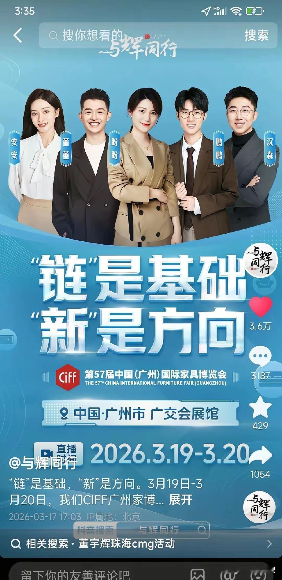 我觉得董宇辉团队今年的节奏,简直就是连轴转。 上海展会刚结束,3月18日珠海又安排上了。这可是央视总台搞的首届“CMG直播电商盛典”。这牌面给的,国家级平台直接背书了。 他一人分身乏术,3月19日开始的广州家博会,只能让盼盼、董董等五个年轻人去挑大梁。 这下咱们可算是看明白了,这就是刻意在给新人铺路,让这群小年轻去单打独斗见世面。 还有个老粉都快忘干净的事。 去年7月他和龙洋在金华录的节目,徒手开瓜闹上热搜那个。 捂了大半年,3月22号傍晚终于要在CCTV1《寻味山海》播了。官方这波卡点放粮的操作,真把流量密码玩明白了。