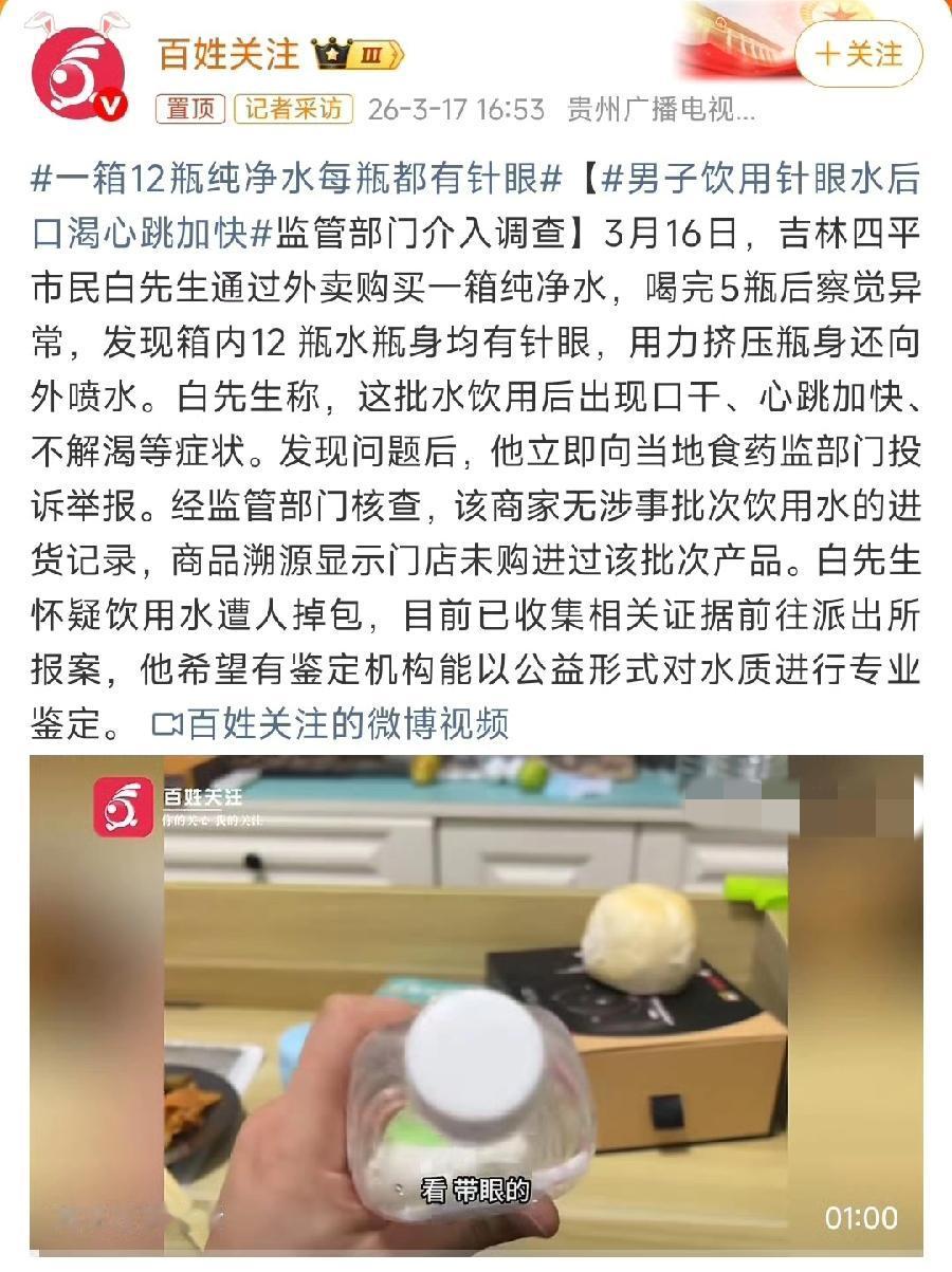 太吓人!外卖买一箱纯净水,12瓶全带针眼,喝后心慌口渴!监管已介入 吉林四平出事了!一男子外卖点了一箱纯净水,连喝5瓶后越喝越渴、心跳加快,浑身不对劲。仔细一看当场头皮发麻——整整12瓶,每瓶瓶身都有针眼,一挤就往外喷水,这绝对不是意外! 谁没事能把一整箱水全扎上眼?细思极恐! 更让人不安的是,监管部门一查,商家居然没有这批水的进货记录,溯源对不上。男子怀疑水被人掉包、甚至动过手脚,目前已经报警,申请水质鉴定,市场监管和警方都已介入调查。 天天喝的瓶装水,居然藏着这种风险!外卖买水、买饮料的朋友一定要注意: 拿到手先看瓶身有没有小孔、裂痕,封口是不是完好,别拧开就喝。喝着不对劲立刻停,保留证据赶紧投诉! 食品安全无小事,入口的东西必须严管。希望尽快查清来源、查清是谁干的,给大家一个安全的消费环境! 你平时外卖买水会仔细检查吗?遇到这种事你会怎么做?评论区提醒更多人! 一箱12瓶纯净水每瓶都有针眼 食品安全 外卖安全 吉林四平