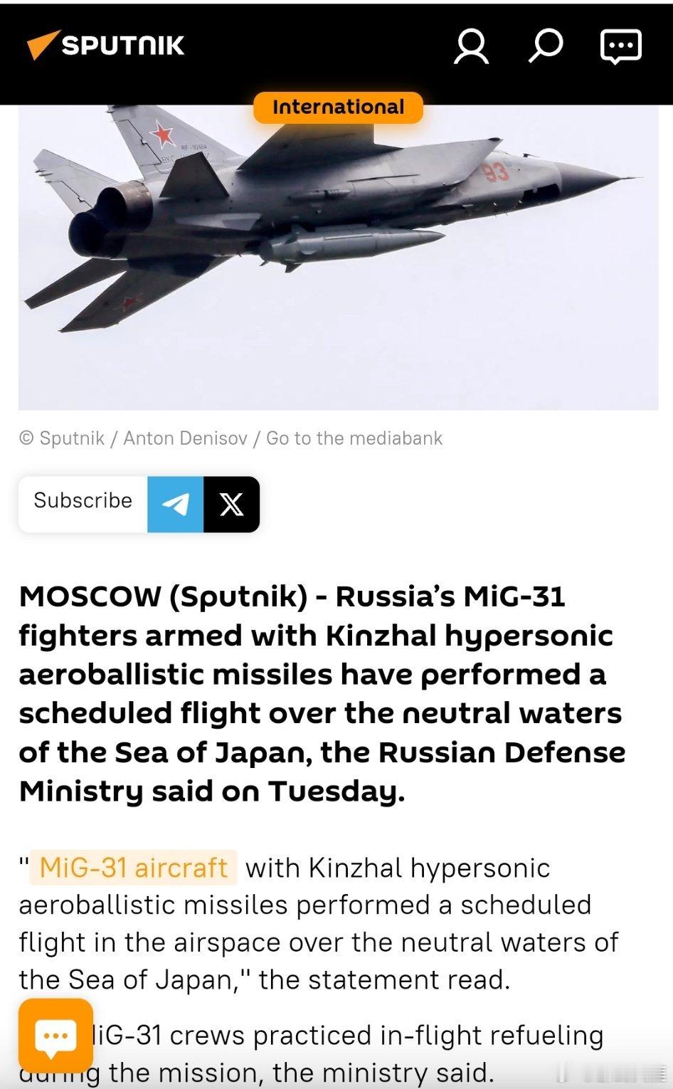 声明称:“配备‘匕首’高超音速弹道导弹的米格-31飞机在日本海的中立水域上空进行了预定飞行。”