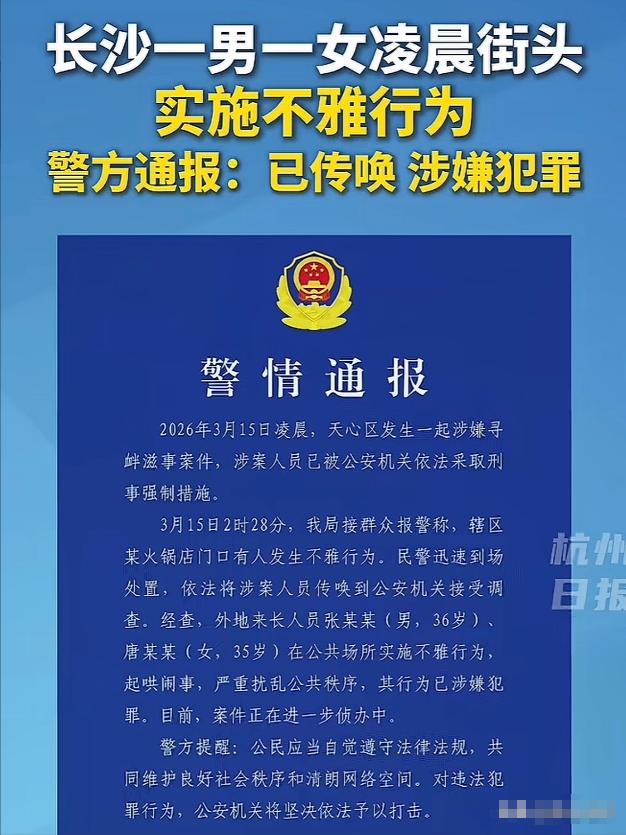“真是林子大了,什么鸟都有!”湖南长沙,一对男女,凌晨时分在一家火锅店门口,做着不堪入目的动作,周围的人都被这一操作整懵了,有人拿出手机拍视频,两人见有人拍竟然还摆起了姿势,有人看不下去直接报了警,没一会帽子叔叔赶到对两人采取强制措施。网友:丢人丢到姥姥家,门口的火锅店都让他们熏臭了! 这事发生在3月15日凌晨,地点在湖南长沙天心区的一家火锅店门口,当时已经是凌晨2点多,街上虽然不如白天热闹,但还有火锅店店员在收尾,还有代驾师傅在歇脚,偶尔有路人经过,本来安安静静的街头,被一对男女的行为彻底打破了。 这对男女不是长沙本地人,男的叫张某某,36岁,女的叫唐某某,35岁,两人是外地来长沙的,当天晚上他们一起喝了酒,酒劲上来之后,就走到了这家火锅店门口,直接在店门口的台阶上做起了不堪入目的不雅动作。 刚开始的时候,周围没几个人注意,后来路过的市民发现了,都被他们的操作整懵了,站在原地看愣了神,没人敢相信有人会在大庭广众之下做这种事。 很快,周围就围过来七八个人,有人觉得太离谱,就拿出手机拍视频,本来大家以为,这两人看到有人拍,会赶紧收敛,没想到他们一点都不害羞,反而更来劲,对着镜头摆起了姿势,还冲周围的人挥手笑,完全不管旁边有店员、有路人,甚至还有带着孩子路过的家长,吓得家长赶紧捂住孩子的眼睛快步走开。 有几位代驾师傅看不下去了,觉得他们太丢人,也严重影响了公共秩序,其中一位师傅直接拿出手机拨打了110报警,把火锅店的位置和两人的行为说的清清楚楚。警方接到报警后,反应很快,只用了8分钟就赶到了现场,民警到场后,先亮明身份,制止了两人的不雅行为,然后劝说他们配合调查,可这两人还嘴硬,说自己只是喝多了闹着玩,没犯法,不用别人管。 民警当场告诉他们,公共场所不能做这种不雅行为,这不仅违背了公序良俗,还严重扰乱了公共秩序,已经涉嫌违法了。 之后,民警就依法对两人采取了刑事强制措施,把他们带上警车,带回派出所接受进一步调查,同时还向周围的围观者取证,把大家拍的视频和目击者的证词都留了下来,作为后续办案的证据。 后来根据警方调查得知,这两人当天晚上是一起谈生意,谈完之后就去吃夜宵,喝了两瓶白酒,喝到凌晨1点多,已经醉得不清醒了,走出火锅店透气的时候,酒劲上头,一时起意就做了那些不雅动作,还对着围观的人起哄,导致现场聚集了很多人,甚至造成了短暂的交通拥堵,严重扰乱了公共场所的秩序。 3月16号晚上,长沙市公安局天心分局发布了警情通报,明确说这两人的行为已经涉嫌寻衅滋事罪,因为他们不仅在公共场所做不雅行为,还起哄闹事,造成了公共场所秩序严重混乱,所以才被采取刑事强制措施,目前案件还在进一步侦办中。 这件事曝光之后,网友们都炸开了锅,很多人都在吐槽,说这两人真是丢人丢到姥姥家了,不仅丢自己的脸,还影响了长沙的城市形象,还有网友替火锅店叫屈,说好好的火锅店门口,被他们弄得乌烟瘴气,都被熏臭了。 还有人说,喝多了不是违法的借口,成年人就得为自己的行为负责,他们本来是来谈生意的,现在倒好,生意没做成,还触犯了法律,真是得不偿失。 可能有人会觉得,不就是做了点不雅行为,至于被采取刑事强制措施吗?其实不是这样的,咱们国家的法律有明确规定,在公共场所起哄闹事,造成公共场所秩序严重混乱的,就构成了寻衅滋事罪,要被追究刑事责任,最高能判五年以下有期徒刑、拘役或者管制。 这两人的行为,不仅仅是不道德,更是触犯了法律,他们以为喝多了就可以为所欲为,却不知道,法律不会因为喝多了就网开一面。 还有现场围观的人,很多人都拿着手机拍视频,其实这样也有风险,如果把拍的不雅视频发到网上传播,就可能涉嫌传播淫秽物品,也会触犯法律,民警当时在现场也提醒大家不要拍了,就是这个道理。 说到底,这事就是两人法律意识太淡薄,又喝了酒,一时糊涂才做了傻事,他们现在也很后悔,但后悔已经没用了。 这也给所有成年人提了个醒,公共场所不是私人领地,不管喝没喝酒,都要守规矩,不能随心所欲,不然不仅会丢面子,还会受到法律的严惩,到头来只能自食恶果。