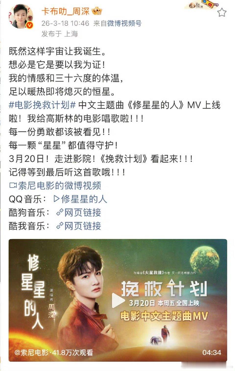 周深说给高斯林的电影唱歌啦 周深唱过的科幻主题曲不少,但这次给高斯林唱,还是有点不一样。大概是《city of stars》那首歌的情怀在,让人觉得这是一场蓄谋已久的相遇。《修星星的人》好听,电影必须支持。