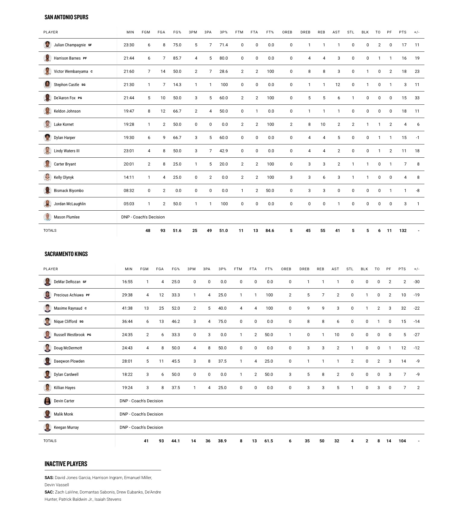 马刺(51-18):文班亚马18分8板3助、凯尔登18分1板1助、尚帕尼17分1板1助、巴恩斯16分4板3助、福克斯15分5板6助、哈珀15分4板5助、沃特斯11分4板2助、布莱恩特7分3板2助、科内特4分10板2助2断、奥利尼克4分6板3助、卡斯尔3分1板12助、麦克劳林3分1助、比永博1分3板