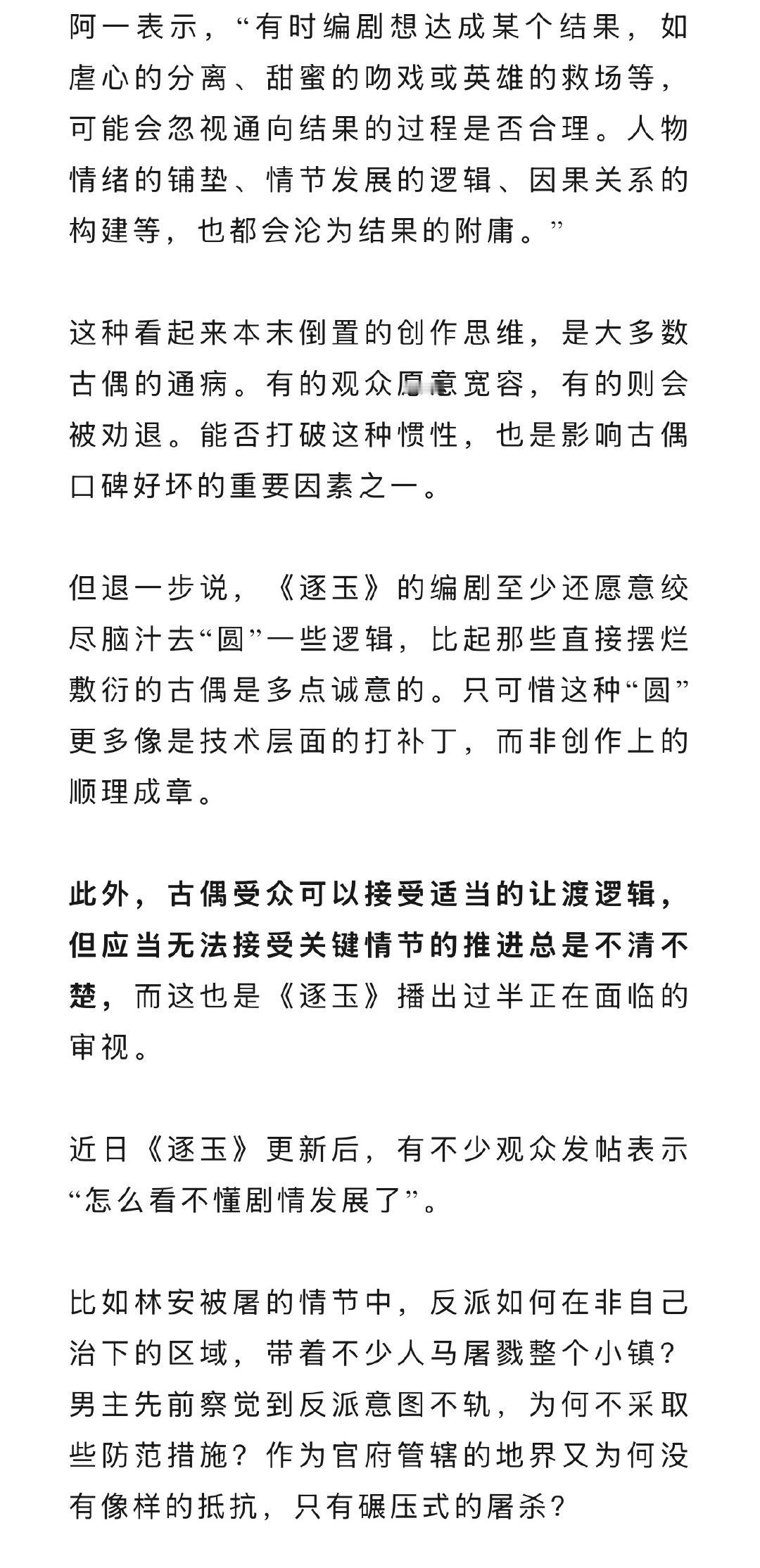 古偶可以抛弃逻辑吗《逐玉》最新云合市占率已突破50%,成绩亮眼。围绕《逐玉》的讨论,既有营销和数据层面的探讨,也有对剧情和人设的解读。在“导演拍得好美”、“男女主颜值好配”、“副CP也好嗑”之类的赞扬声中,还夹杂着“叙事逻辑是否合理”的争议。不妨借着《逐玉》再度讨论一下,古偶可以抛弃“逻辑”吗?