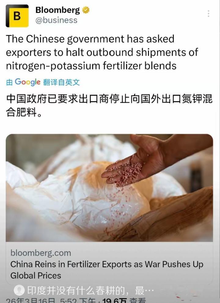 开始了,中国禁止化肥出口,先保国内粮食。而现在最担心出现粮荒的国家是谁呢?是印度!印度每年消费的尿素中,约四分之一(25%) 需要依赖进口,是全球最大的尿素进口国。在2025年4月至2026年2月期间,印度从中国进口了212.4万吨尿素,占其同期总进口量的28.5%,而中东战争爆发之后,随着霍尔木兹海峡局势紧张和天然气供应中断,印度部分尿素工厂被迫停产,这就产生了用量告急。 印度国内现在挺麻烦,因为打仗,卡塔尔的液化气过不来,好多化肥厂没原料,像印度农民化肥合作社(IFFCO)这样的厂家都已经开始减产了。有人还警告说,要是断供时间长了,工厂可能就得关门。 一边是自己产的少了,一边是马上就要到6月份的耕种季,地里等着用肥,这缺口一下子就大了。 别看印度政府自己说手里还有几百万吨的库存,暂时够用,但那都是虚的。 真要到了6月份,全国农民都下地插秧的时候,那点库存根本撑不住。到时候如果搞不到足够的化肥,粮食产量就得往下掉,十几亿人的吃饭问题就悬了。 所以印度现在急得团团转,已经拉下脸来找中国帮忙,希望咱们能松松口,卖点尿素救急。 毕竟之前印度进口的尿素里头,差不多三成都是中国货,这渠道突然断了,找别人补货哪那么容易?俄罗斯虽然也能供点,但远水解不了近渴。 再说中国这边,肯定是先把自家地喂饱再说。咱们2026年的关税方案写得明明白白,化肥出口还是卡得死死的,就是为了保证国内春耕。 听说最近连复合肥的出口都停了,就剩下硫酸铵还能往外走一点。 在这个节骨眼上,粮食安全比啥都大,不可能为了帮别人把自己给搭进去。 说句实在话,印度这遭遇到的麻烦,说白了就是平时没留后手,关键时刻被人卡了脖子。自己的工业生产靠进口天然气,化肥不够了靠进口中国货,两头都在外面飘着,风一吹就晃。这其实也给咱们提了个醒,手里有粮、有肥,心里才能不慌,这种战略物资的主动权,必须攥在自己手里,靠谁也不如靠自己稳当。