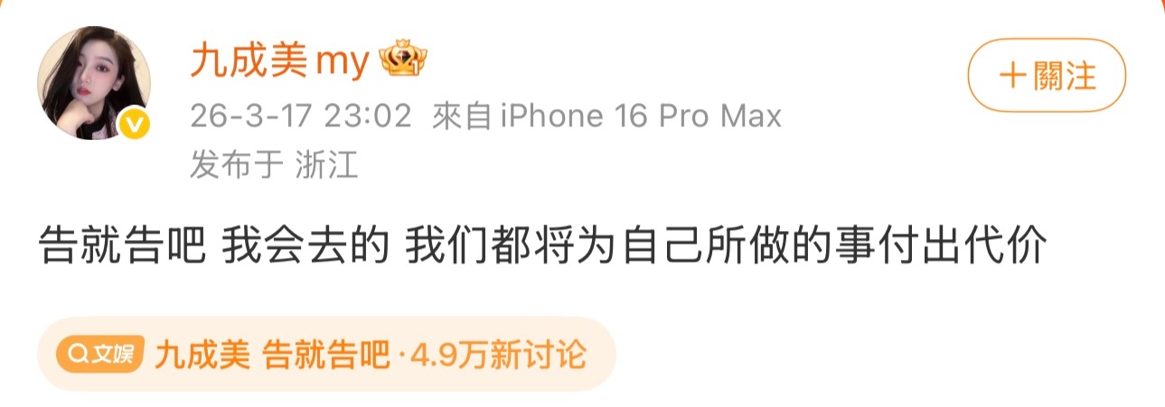 田栩宁工作室已申请立案,九成美回应「告吧告吧,我会去的,我们都将为自己所做的事付出代价。」。