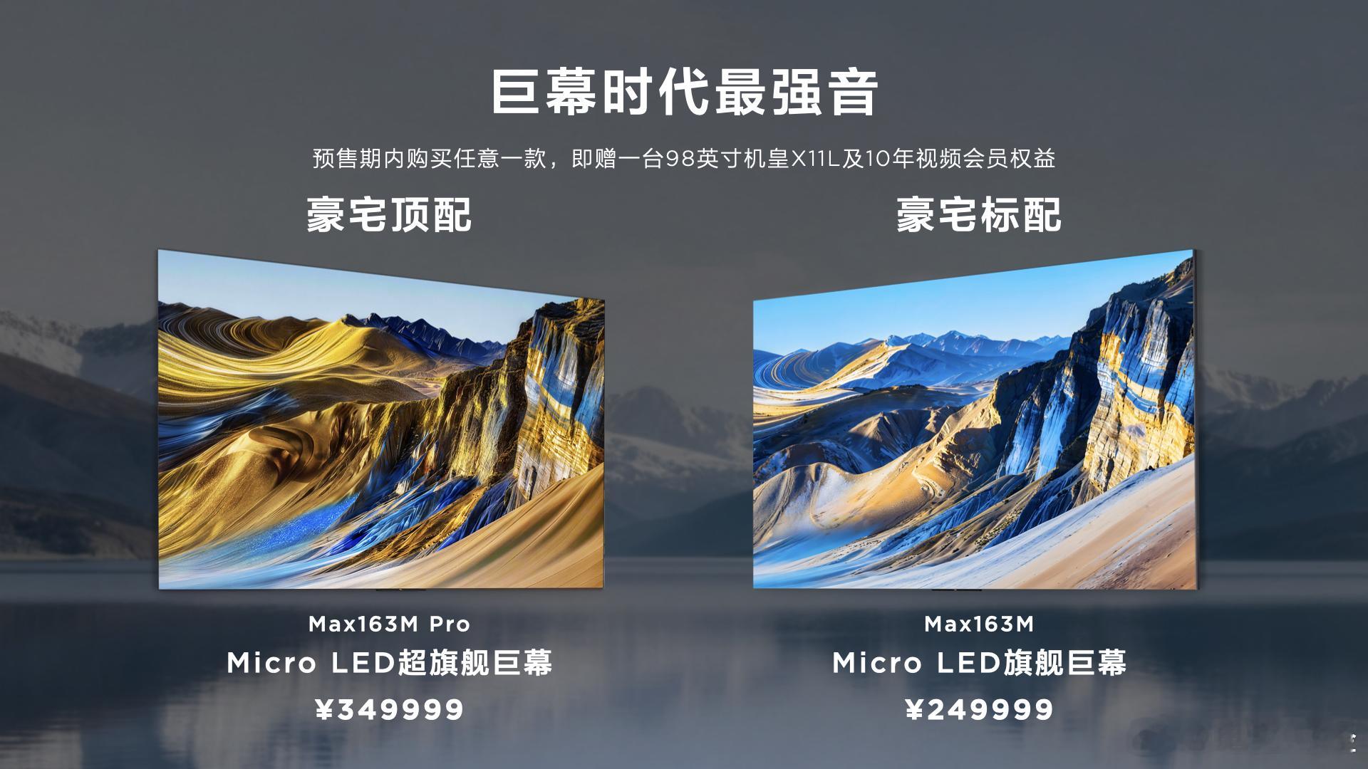 在普及SQD-Mini LED的同时,TCL还带来巨幕时代的最强音——163吋Micro LED旗舰巨幕双曜登场。豪宅顶配的Max163M Pro与豪宅标配的Max163M,均搭载2488万多颗无机自发光芯片,实现真4K实像素,其中Max163M Pro峰值亮度直达XDR 10000+nits。从2024年百万元级到如今Max163M定价249999元,TCL正将Micro LED从遥不可及的收藏品变为豪宅首选,让超沉浸式的巅峰画质体验进入更多家庭。