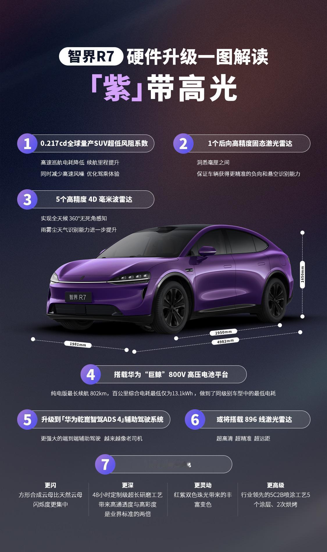 智界R7和新S7的极光新色「暗夜紫」今天首发亮相,灵感来源于神秘罕见的紫色极光 3月23日上市,同一天还有尚界Z7/Z7T和问界M6开启预订,华为这是要包场的节奏?😎 余承东前几天预告过:这次智界焕新不只是换皮肤,座舱和智驾能力都会升级。 具体来看: R7升级点:新增1个高精度固态激光雷达、6个车外麦克风(实现车外车内隔窗对讲/车外语音控车)、1套3分布式4D毫米波雷达矩阵(雨雾尘天气AEB也能刹停)、2个4D毫米波角雷达。传感器总数36个,标配ADS 4。 S7升级点:全系标配192线激光雷达+后向高精度固态激光雷达+4D毫米波雷达,同样搭载ADS 4。还新增R7同款16.1英寸3K屏+语音控车体验+隔窗对讲功能。 暗夜紫+小蓝灯+车外语音+ADS 4...这套组合,你心动了吗?