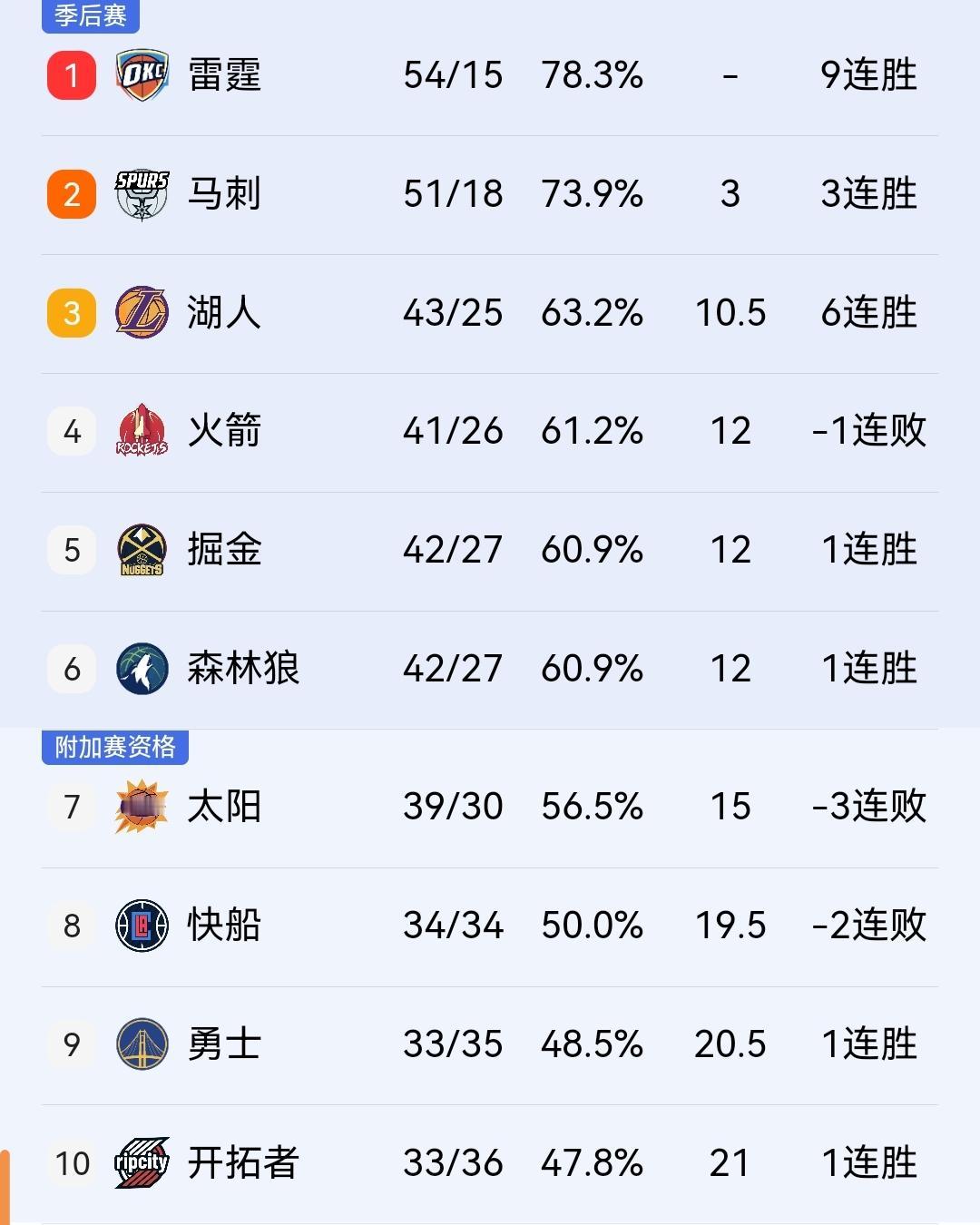 麻烦了,掘金、森林狼双双赢球,火箭再输恐怕要去打附加赛了! 今天比较引人关注的两场比赛,掘金、和森林狼都各自战胜了对手。由于昨天火箭主场输给了直接竞争对手湖人。虽然他们依然排名第四,但领先优势微乎其微。 西部前二的排序几乎已经确定,第三到第七位存在很大的变数。状态来看,湖人大概率会锁定第三。而胜场已经被追平的火箭很有可能被身后的掘金和森林狼超越。 不止如此,火箭和处在附加赛区域的太阳胜场仅有3个。明天火箭将继续与湖人交手,面对豪取六连胜的湖人,火箭没有必胜的把握,很可能遭到湖人双杀。 假如火箭输球,不只是会被掘金森林狼超越,太阳赢球的话,还将近一步缩小与火箭的差距。 这样一看,火箭麻烦了,形势非常严峻。而且他们的对手也比较强劲,未来五场有湖人、老鹰、公牛、热火、森林狼。 相对于火箭,太阳的对手难度小了很多。接下来将与雄鹿、猛龙、掘金、爵士、灰熊一较高下。